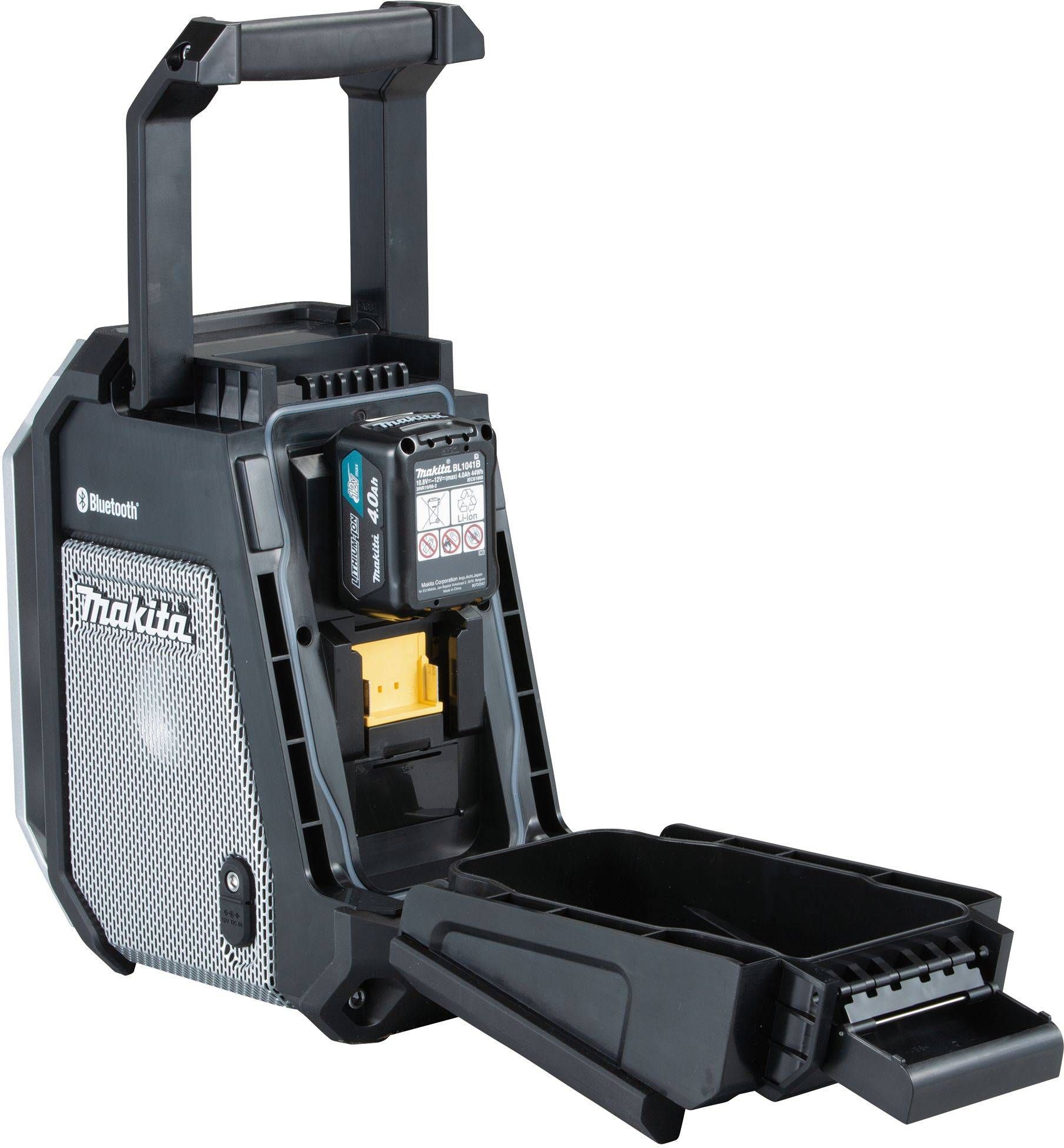 Makita DMR114B akuraadio töötab Makita akudega või vooluvõrgust. Sobilikud akud on: CXT seeria akud 10,8/12V Max, LXT seeria akud 14,4/18 V. Ei tööta Makita G-seeria akudega! Varustatud Bluetoothiga, võimaldades juhtmevabalt mobiiltelefonist muusikat mängida. AUX-port MP3-mängija ühendamiseks ja USB-port mobiiltelefoni laadimiseks. Sellele raadiomudelile on lisatud mitmeid uuendusi. Raadio antenn on nüüdsest ehitatud kandekäepideme sisse, raadio põhja alla on lisatud bassikõlar mis lisab helidele sügavust ja mitmekesisust. Esimest korda ajaloos on lisatud sellele raadiole ka ekvalaiser, mis võimaldab valida kuue erineva eelseadistatud sätte vahel + seitsmendaks ekvalaiseri sätteks on oma isikliku ekvalaiseri seadistamine. Selliselt saate kuulata oma Makita raadiot just täpselt nii nagu Teile endale meeldib. Tolmu- ja niiskuskindel ehitus, mis vastab IP65 nõuetele.