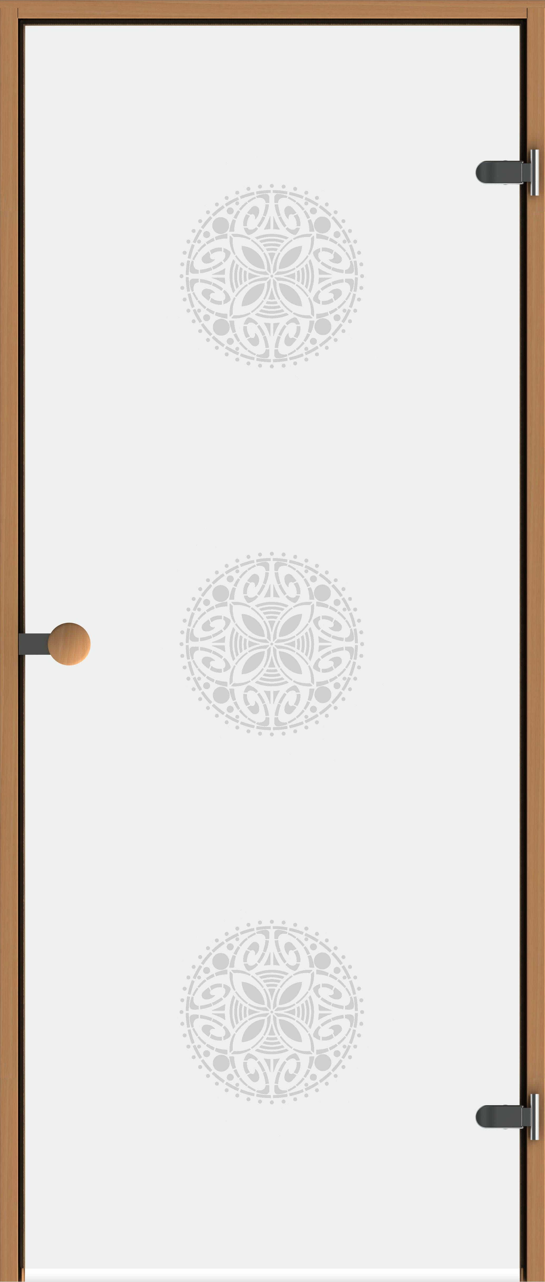 Swedoor saunauks Purity Ornament W. Uks on valget värvi ja muster on siiditrükis. Lengi välismõõt on 690 x 1890 mm. Saunaukse käelisus on universaalne.