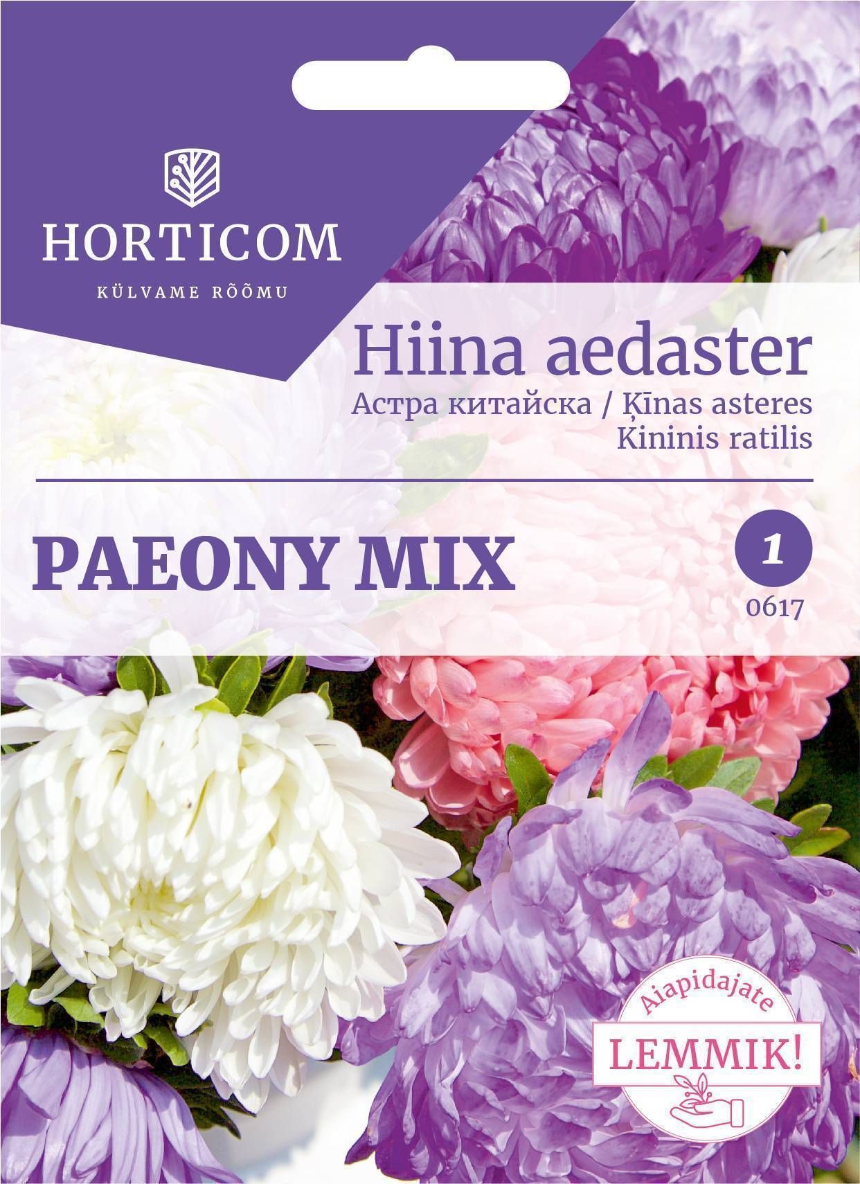 Horticom hiina aedaster Paeony mix on üheaastane pojengaster, mis kasvab 60-70 cm kõrguseks. Ilusad, suured täidisõisikud, 10-12 cm. Pika õitsemisajaga. Sobib lõikelilleks, püsivad vaasis 10-12 päeva. Kasvuks sobib päikesepaisteline soe koht ja viljakas muld. Seeme idaneb +18°C juures 7-11 päeva.