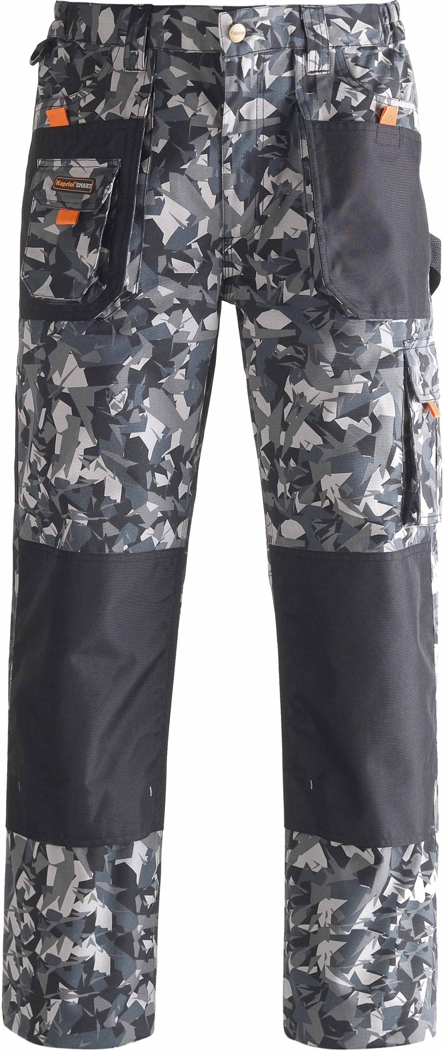 Kapriol Smart Camoflage kauakestvad tööpüksid on mitmeotstarbelised, vastupidavad ja tugevdatud õmblustega. Pükste materjaliks on puuvill ja polüester. Pükstel on hall kamuflaaž muster ning suurus on M.