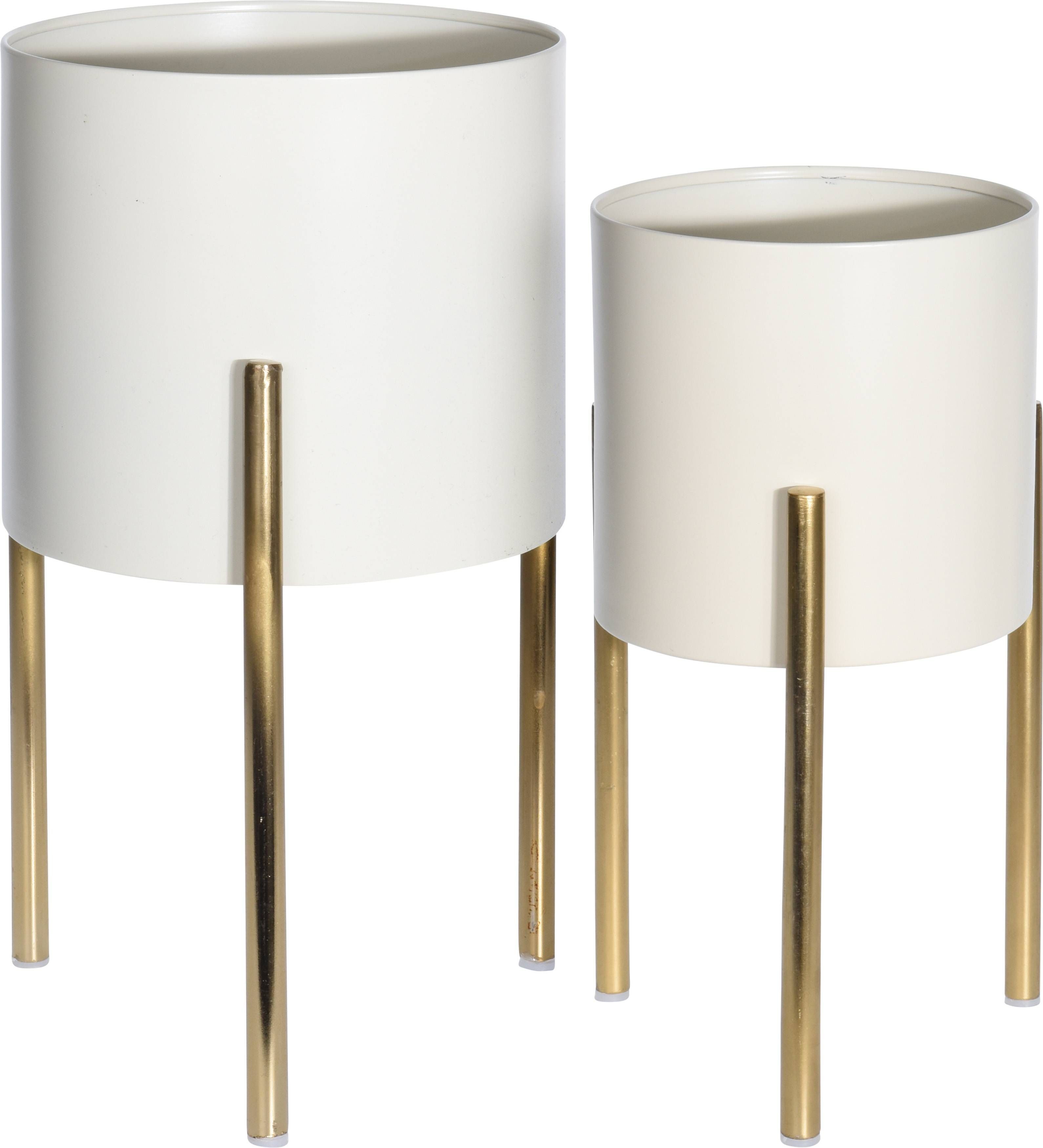 Metallist ümbrispottide komplekt, kuhu kuuluvad kaks ümbrispotti. Suur ümbrispott on mõõtmetega 19 x 19 x 36 cm ja väike 15,5 x 15,5 x 29,5 cm. Ümbrispotid on valget värvi ja jalad kuldsed.