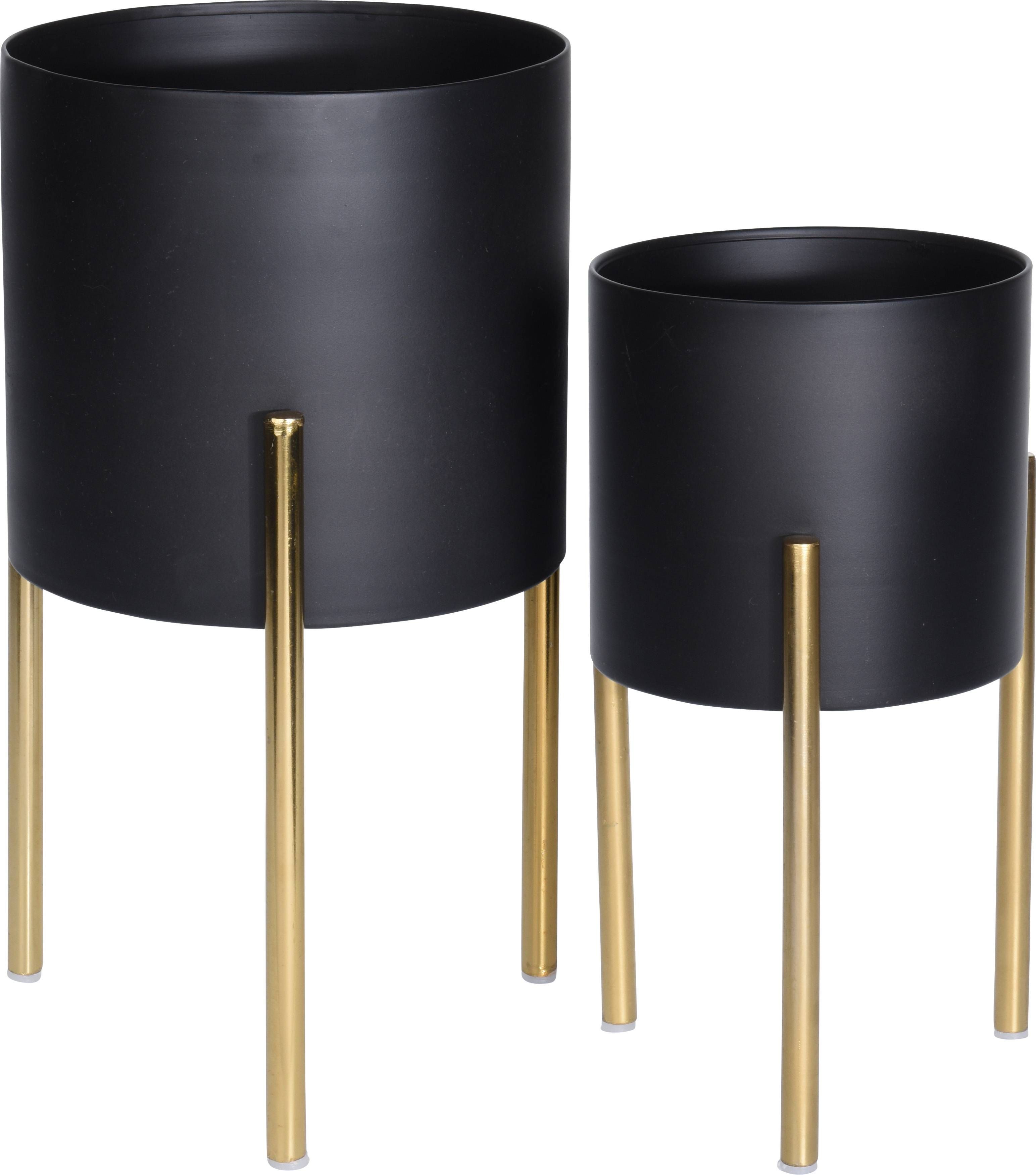 Metallist ümbrispottide komplekt, kuhu kuuluvad kaks ümbrispotti. Suur ümbrispott on mõõtmetega 19 x 19 x 36 cm ja väike 15,5 x 15,5 x 29,5 cm. Ümbrispotid on musta värvi ja jalad kuldsed.