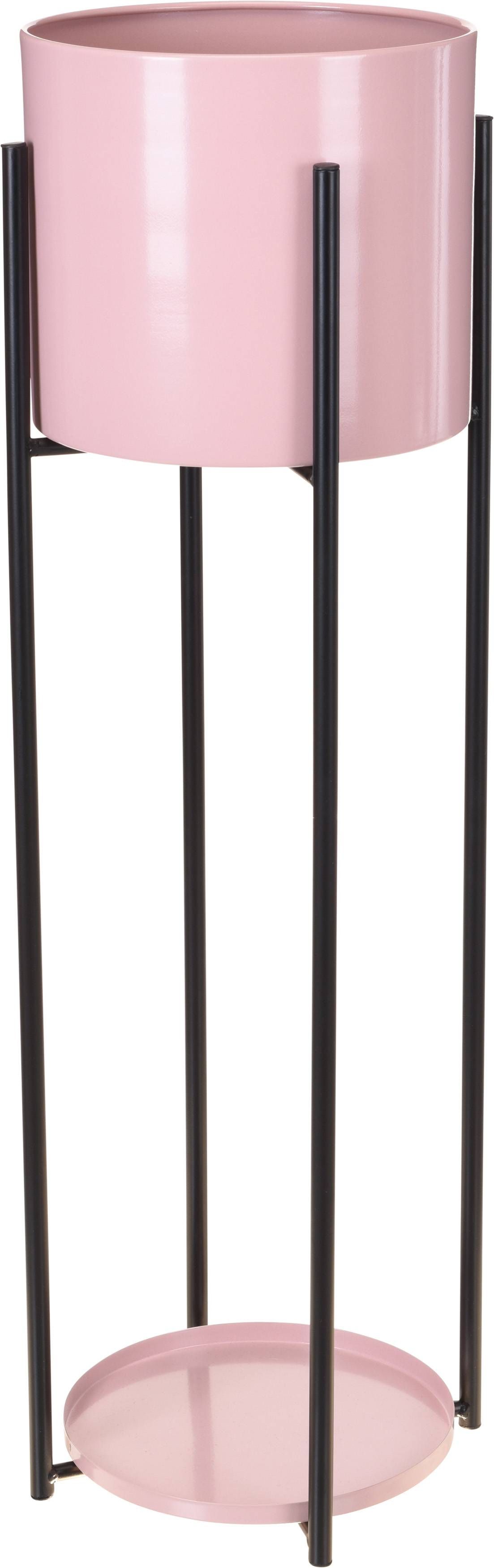 Metallist ümbrispott jalgadel. Ümbrispoti läbimõõt on 23 cm ja kõrgus 20 cm, jalgade kõrgus 75 cm ja alustaldriku läbimõõt 23 cm. Ümbrispott on roosat värvi ja jalad musta värvi.