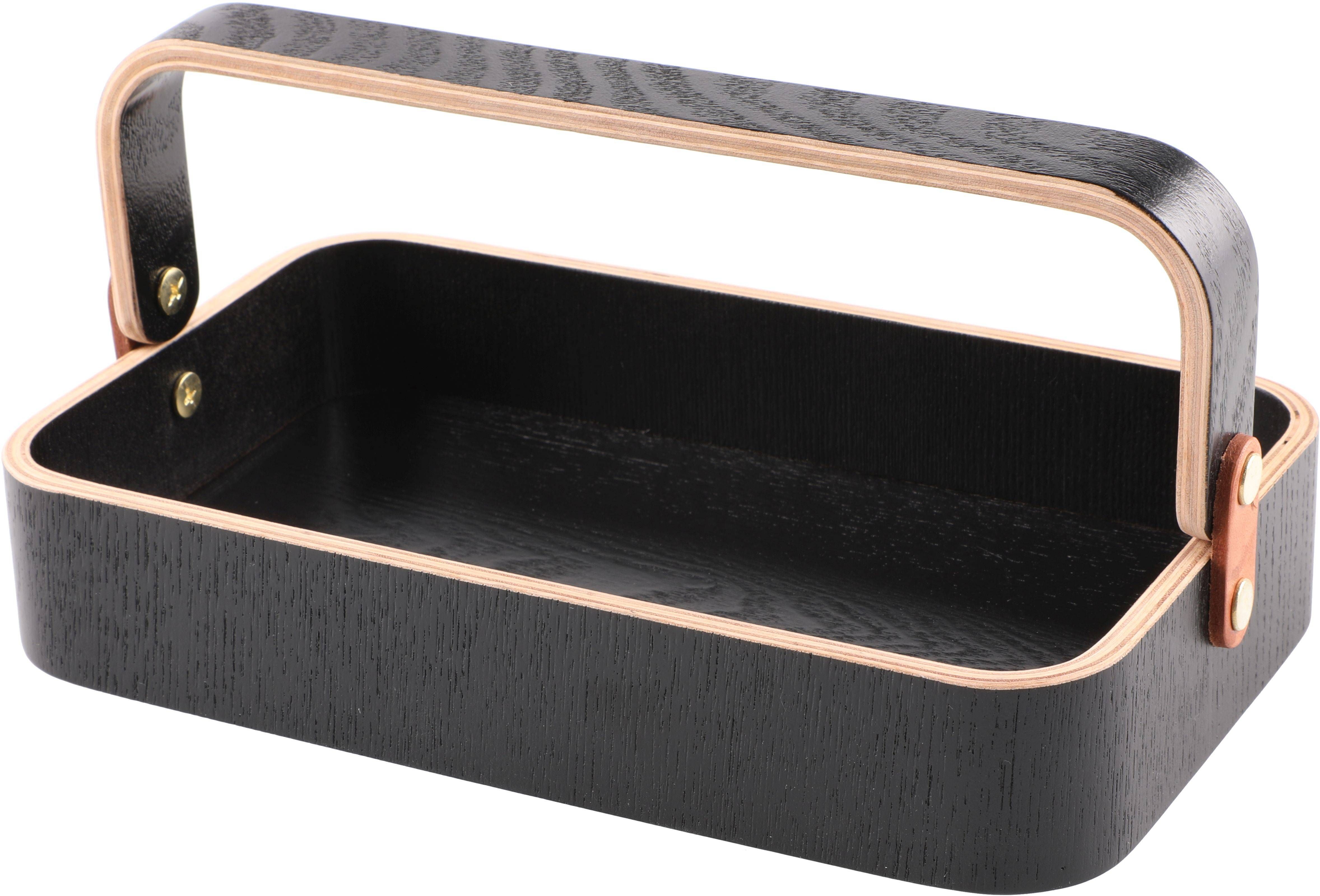 • Stiilne sangaga vineerist kandik ladustamiseks ja serveerimiseks. • Mõõtmed on 14 x 23 x 10,5 cm. • Musta värvi. • 14-päevane tagastusõigus.