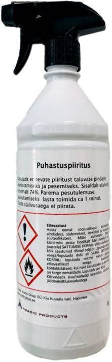 Nordic Products pihustiga puhastuspiiritus sobib kasutamiseks erinevate piiritust taluvate pindade puhastamiseks. Sisaldab etanooli vähemalt 74%. Parema pesutulemuse saavutamiseks lasta toimida ca 1 minut. Toote säilivusaega ei piirata. Pakendis on 1 liiter.