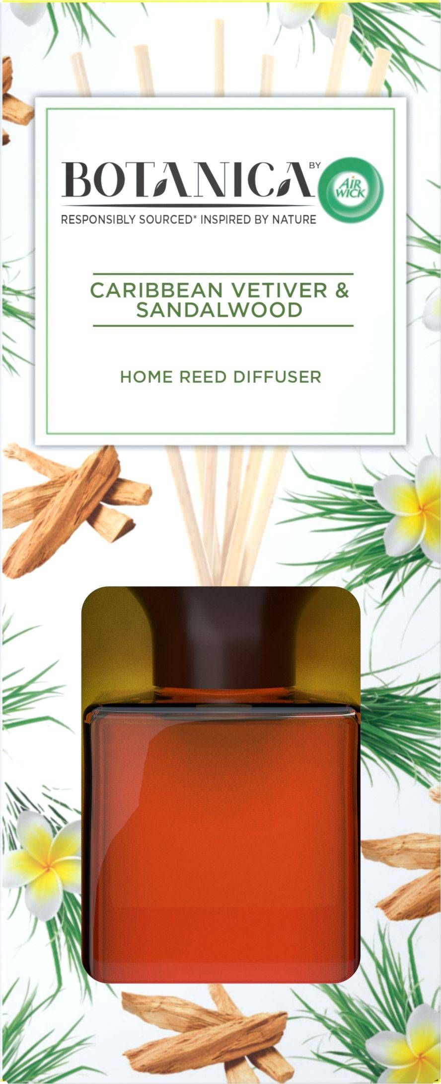 Air Wick Botanica roost lõhnahajuti Kariibi Vetiver & Sandlipuu on valmistatud eksootiliste looduslike koostisosadega, mis on hoolikalt hangitud viisil, mis austab meie planeeti. Vastutustundlikult hangitud looduslikud lõhna koostisosad. Ei sisalda ftalaate ega värvaineid. Ei sisalda midagi peale vajalike koostisosade: Lõhnaine on eeterlikud õlid ja abiane on lahus, mis aitab lõhna eraldmusit. See lõhnahajuti kasutab imelise lõhna delikaatseks hajutamiseks looduslikke rotangpalmi varsi. Kestab kuni 45 päeva. Looge oma kodus meeldiv õhkkond selle loodusliku lõhnakogemuse ja elegantse disainiga. Lõhna kirjeldus: rõõmustage oma meeli Kariibi mere ehtsa vetiveri värskusega ja sandlipuu soojusega.