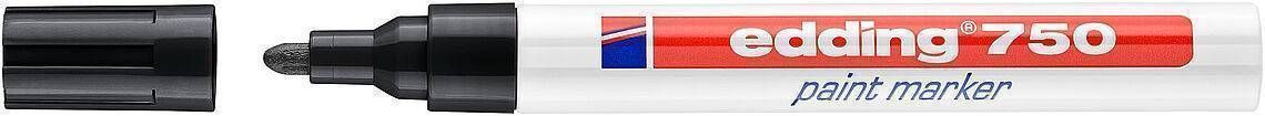 Edding 750 musta läikiva markeriga saab kirjutada enamustele siledatele ja ka poorsetele pindadele näiteks: klaas, plastik, puit ja metall. Toimib hästi ka tumedatel ja läbipaistvatel pindadel. Veekindel, kiiresti kuivav. Talub kuni 400 kraadist kuumust. Pumpsüsteem, raputada enne kasutamist, eemaldada kork ja pumbata. Alumiiniumkestaga ja ümara otsaga. Joone laius on 2-4 mm.