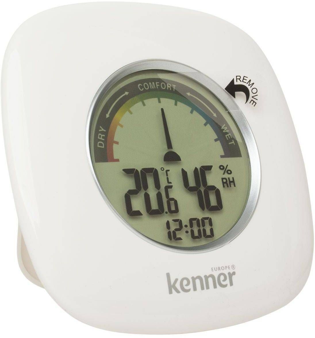 Kenneri täpse digitaalnäidikuga sisetermomeeter (C/F) ja hügromeeter (RH%) /elektrooniline kell koju, kontorisse või töökotta. MIN ja MAX temperatuurid ning õhuniiskuse näidud salvestuvad mällu. 5-tasemeline keskkonna mugavuse indikaator. Sisetemperatuurmõõtevahemik -5°C kuni +50°C. Siseruumi suhtelise niiskuse vahemik 20% kuni 90% . Temperatuuri mõõtühikute valik Celsius või Fahrenheit. 12 ja 24 tunnine ajanäit. Kaasas seinakinnituse pesa ja klappalus lauale paigutamiseks. Patareid 2 X LR44 komplektis. Täismahus kasutusjuhend eesti keeles on pakendis.