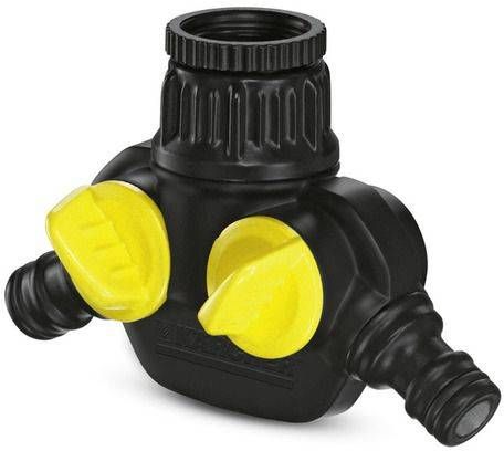 Kärcheri kõrgekvaliteetne kahesuunaline jaotur ning G 3/4 kraani ühendus ja G 1/2 reduktor võimaldavad kasta samaaegselt kuni kahe voolikuga. Kahesuunalisel jaoturil on kaks kraani ühendust koos kahe sõltumatu kontrolleriga ning optimaalse veevoolu kontrollfunktsioon. Seda saab kasutada universaalselt koos standardsete aiavoolikutega ning sellel on muljetavaldav kvaliteet ja ergonoomiline disain, mis muudab seadme käsitsemise eriti mugavaks ja lihtsaks. Sujuvalt toimiv ühendusliides, millel on töökindel sisekeere, ning mis tagab lihtsa ja mugava ühendamise veekraaniga. Kahesuunaline jaotur sobib enamike kiirkinnitussüsteemidega.