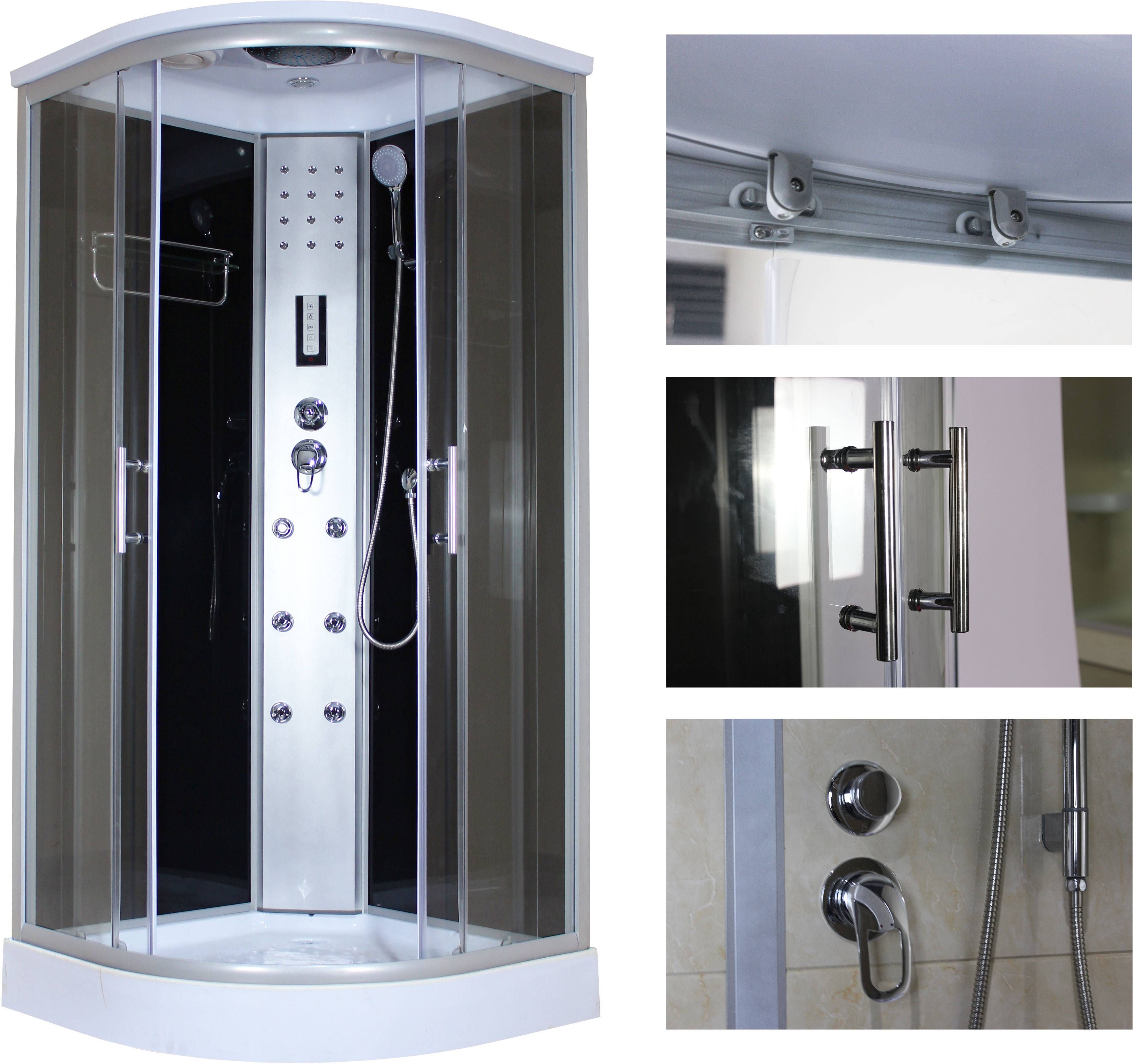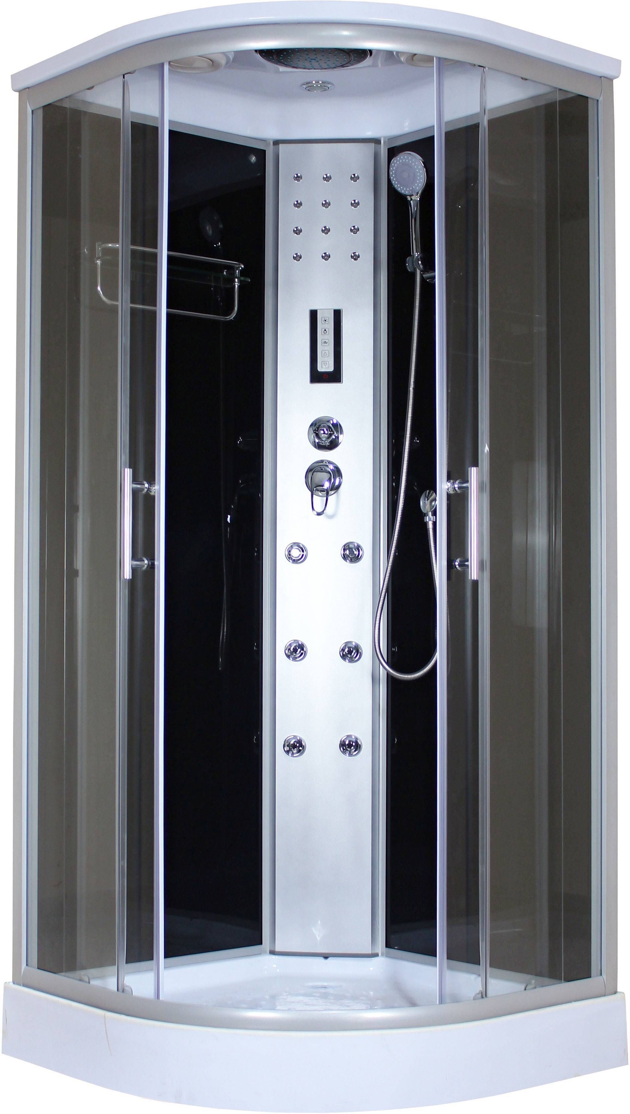• Massaažikabiin mõõtmetega 90 x 90 x 220 cm ja alusvann on 15 cm kõrgune. • Uksed ja esisein on kirkast 4 mm turvaklaasist ja tagasein 4 mm mustast turvaklaasist. • Kabiinil on 6 seljamassaažidüüsi, segisti, laedušš, käsidušš, juhtpaneel, valgusti laes ja seinas, raadio, ventilaator ning riiul. • Komplektis on äravoolupesa koos sifooniga ja alus koos jalgadega. • 14-päevane tagastusõigus.