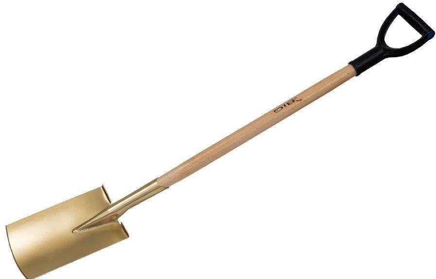 BiG metallist tugevdatud labidas, millel on puidust lakitud vars ja plastikust käepide. Labidas on kuldset värvi.