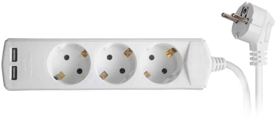Tesatek pikendusjuhe 3G1,0 mm², millel on kolm pesa ja 2 x USB pesa. Pikendusjuhtme pikkus on 1,5 meetrit, valget värvi.