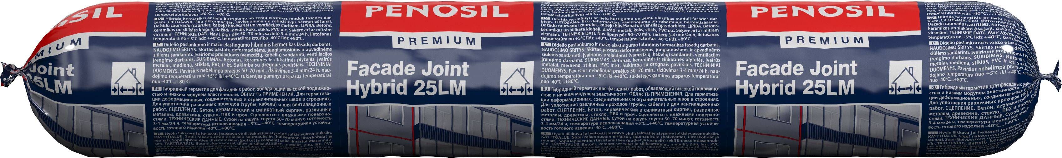 Penosil Facade Joint Hybrid 25LM fassaadihermeetik on kvaliteetne hübriidpolümeeril põhinev väikese elastsusmooduliga fassaadihermeetik. Sobib täitmiseks ja tihendamiseks nii sise- kui välistingimustes. Suure liikuvusega (±25%) ja väikese elastsusmooduliga. Lihtne töödelda ja siluda. Hea nake paljude poorsete ja mittepoorsete pindadega, isegi niiskete pindadega. Laitmatu elastsuse ja aluspinnaga nakkuvuse püsivus. Ei põhjusta metallide korrosiooni. Vastupidav UV-kiirgusele, erinevatele ilmastikuoludele ja vananemisele. Minimaalne kahanemine tardumise ajal. Püsivalt elastne. Keskkonnasäästlik, ei sisalda lahusteid, silikoone ega isotsüanaate. Värvitav vesialuseliste värvidega.