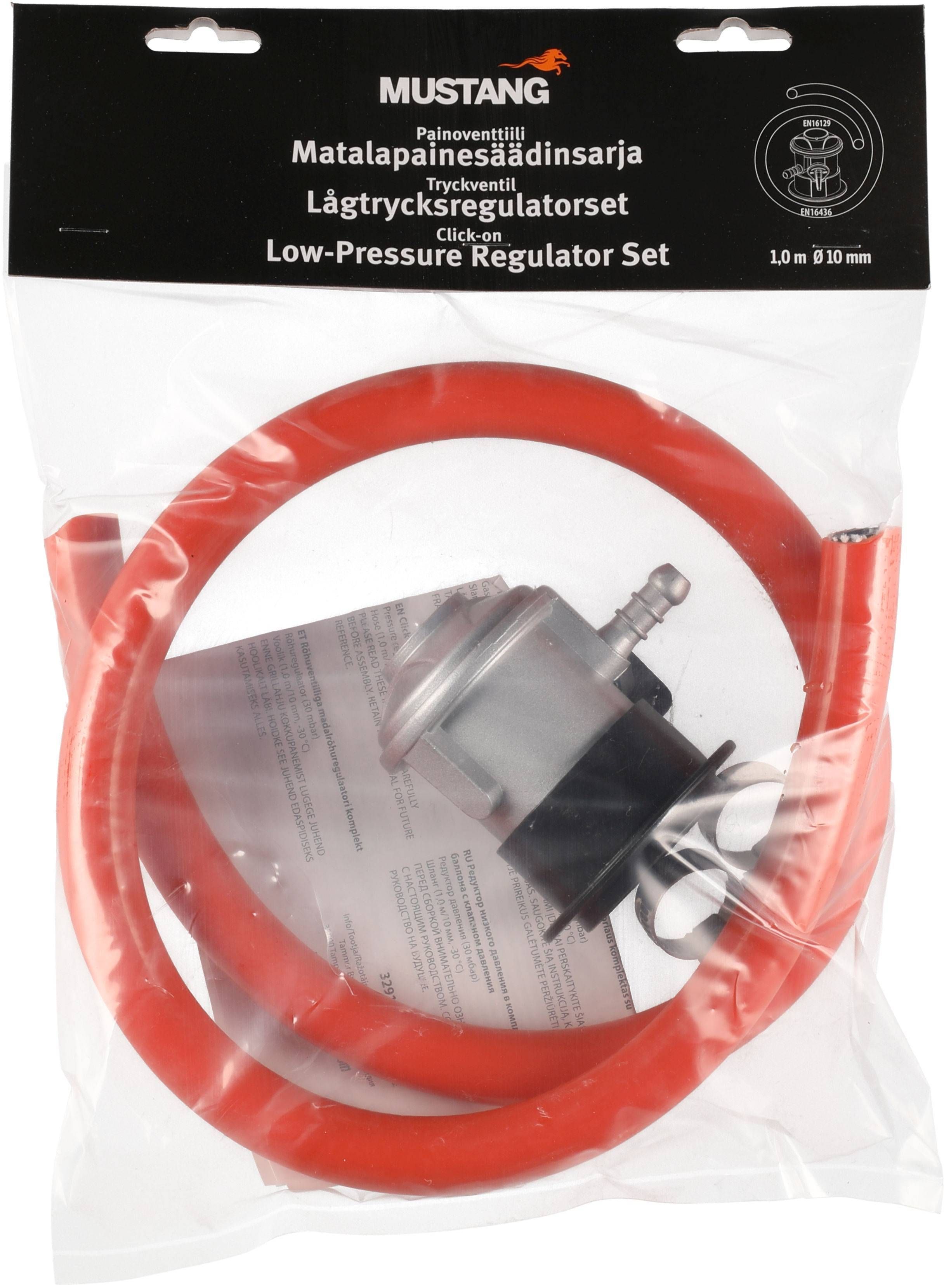 Mustang gaasiregulaatori komplekt voolikuga. Vooliku pikkus on 1 m, diameeter 10 mm ja läbivool 1,5 kg/h. Gaasiregulaator on 30 mbar ja külmakindlus on -30°c. Komplektis on 2 voolikuklambrit.