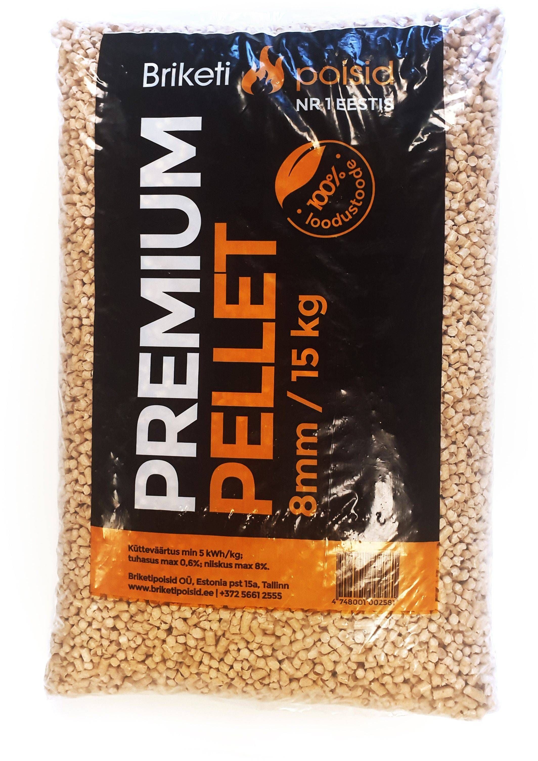 Briketipoisid puidugraanul 8 mm. Loodustsäästev tahke biokütus, mis on valmistatud puhtast Eesti toorainest, kütteväärtus min 5 kWh/kg, tuhasus max 0,6% ja niiskus max 8%. Pakis 15 kg.