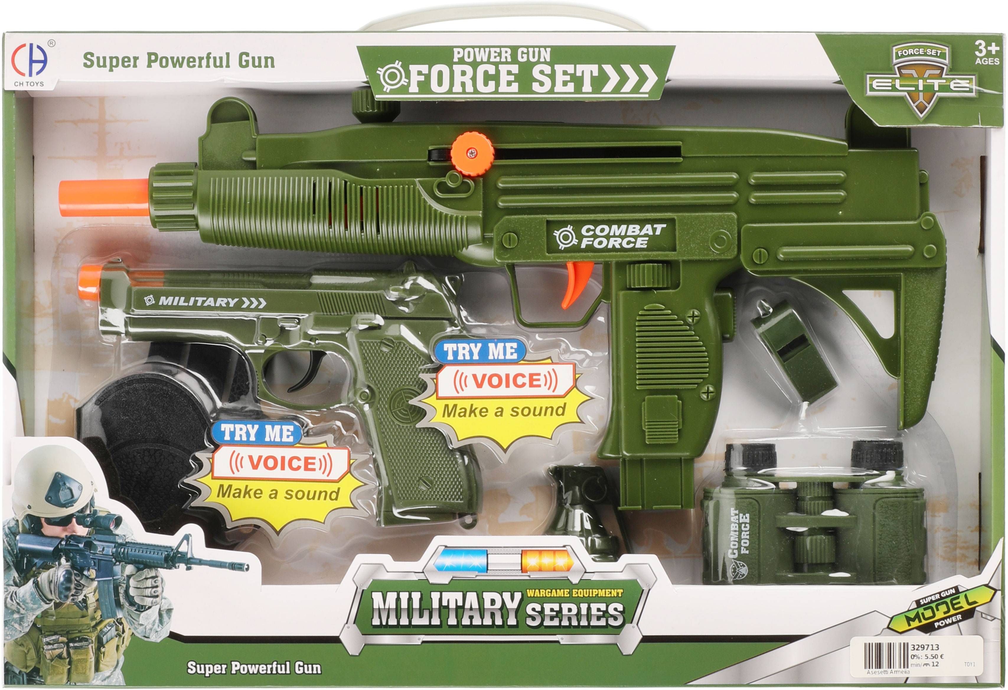 Mängupüstolite komplekt. Sisaldab 2 püstolit, granaat, vile ja binokkel. Heliefektidega.