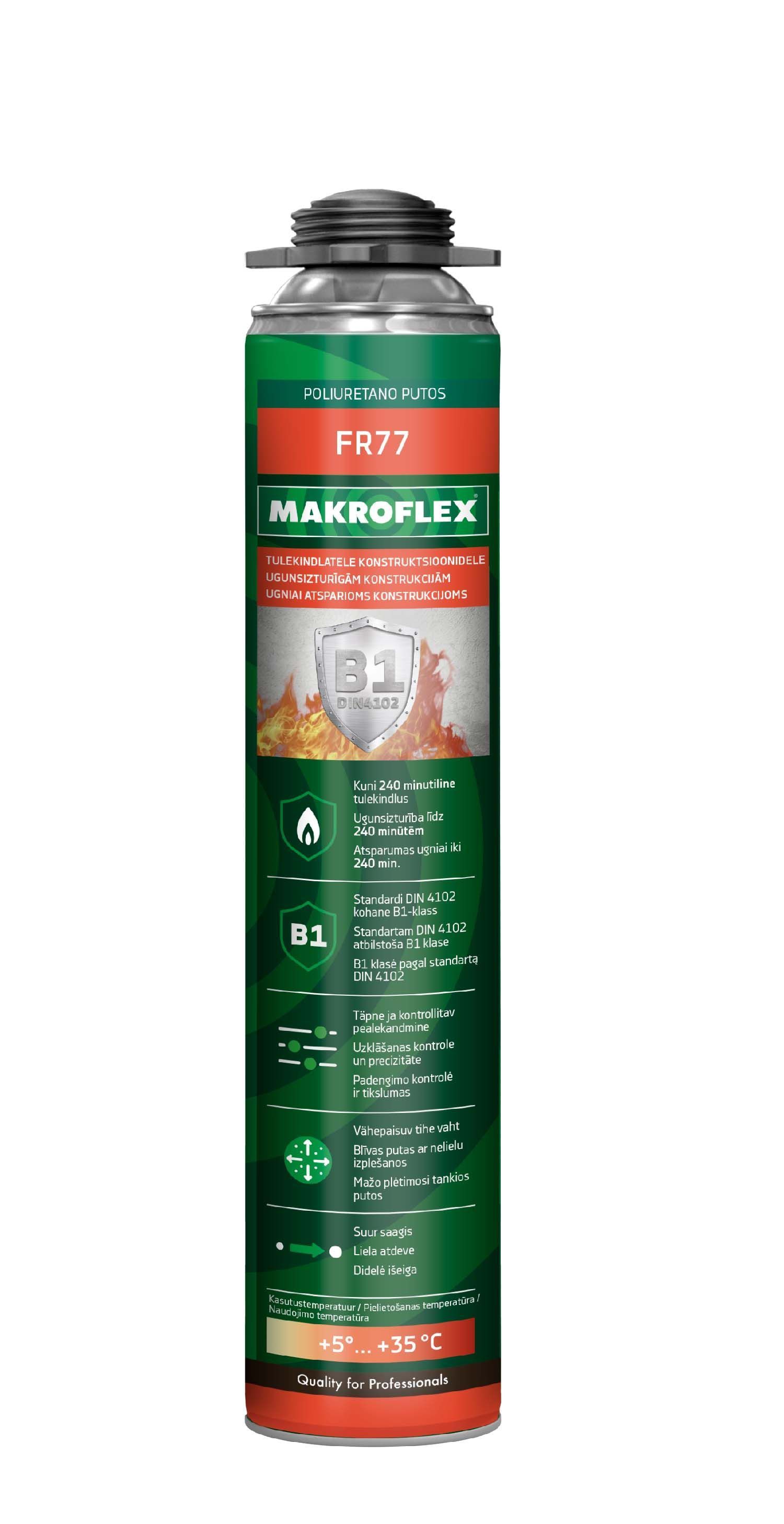 Makroflex FR 77 GF tuletõkke montaaživaht vuukide täitmiseks mineraalsete materjalide või metallide vahel kohtades, kus kehtivad erinõuded tulekindluse ja tulekahju korral käitumise suhtes. Sellise kasutusviisi korral tagab vaht Euroopa ehitusmaterjalide standardi B-klassile ja Saksa standardi B1-klassile vastava kuni 240-minutilise tulekindluse. Nakkub kõigi tavaliste ehitusmaterjalidega, välja arvatud polüetüleen, silikoon, õlid ja määrded, vormimäärded jms. Vahu kasutamise ajal peab õhu ja materjalide temperatuur jääma +5°C kuni +25°C vahemikku. Tahkunud vaht on poolkõva, elastne, üldiselt suletud kärjega, ei mädane ning säilitab oma omadused temperatuurivahemikus -40°C kuni +80°C. Vaht ei vanane aja jooksul, kuid ei talu UV-kiirgust. Väga hea soojus- ja heliisolatsiooniga. Vahu püstolist pealekandmine on kerge, puhas, kiire ja täpne, mis muudab tööprotsessi sujuvaks, vastates eelkõige professionaalsete ehitajate nõuetele. Pakendis 750 ml.
