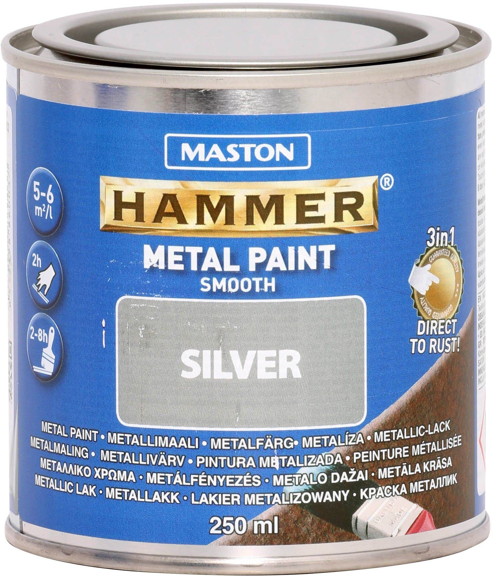 Maston Hammer hõbedane metallivärv, kus korrosioonivastane aine, krunt ja pealisvärv moodustavad koos tugeva, läikiva pinna kõigile metallpindadele. Sobib kasutamiseks sise- ja välistingimustes. Saab kanda otse töödeldud pindadele, sealhulgas roostes pindadele. Õhku ja niiskust mitteläbilaskev värvikiht peatab korrosiooni ja kaitseb tõhusalt metallpinda. Sobib ka puitpindade töötlemiseks. Metallvärvi katvus on umbes 5 - 6 m²/L, sõltuvalt pealekandmisest ja pealekandmisviisist. Kuivamisaeg on umbes 24 tundi. Täielikult kuiv 7 päeva pärast ja vajadusel ülevärvitav 2 - 8 h jooksul või 8 päeva pärast (+ 20°C/24 h) ainult samatüübilise värviga, st Maston Hammeri värviga. Eeltöötlus: Eemaldage värvitavalt pinnalt lahtine rooste, lahtine ja pragunev värv traatharjaga. Puhastage pind õlidest, rasvadest ja igasugusest muust mustusest. Enne värvimist kuivatage niisked pinnad. Enne kasutamist segage värv hoolikalt. Samuti segage värvi töö ajal. Värvimine: Pintsliga - kasutage sobiva laiusega pintslit, kandke pintsliga risti harjates paks ühtlane värvikiht. Pinna viimistlemiseks pintseldage pind kergelt samasuunaliselt. Vajadusel saate viimistlust uuendada. Rulliga - kasutage looduslikku kiudrulli. Katke pind ühtlaselt. Vajadusel võite värvi lahjendada Hammer XYLENE lahustiga. Pihustiga värvimisel lahustada värvi 5 - 20%. Pakendis 250 ml.