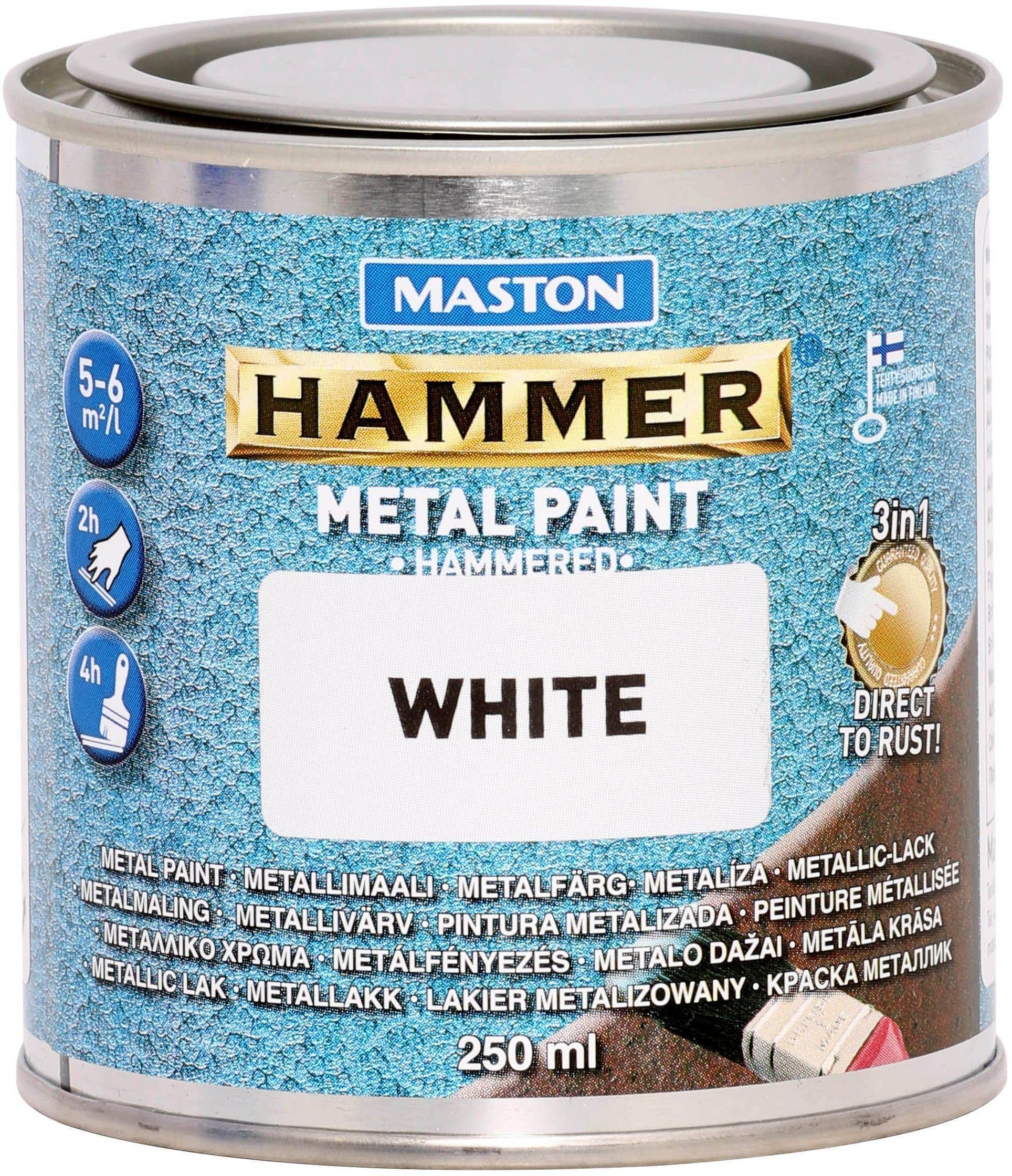Maston Hammer valge vasardatud metallivärv, kus korrosioonivastane aine, krunt ja pealisvärv moodustavad koos tugeva, läikiva pinna kõigile metallpindadele. Sobib kasutamiseks sise- ja välistingimustes. Saab kanda otse töödeldud pindadele, sealhulgas roostes pindadele. Õhku ja niiskust mitteläbilaskev värvikiht peatab korrosiooni ja kaitseb tõhusalt metallpinda. Sobib ka puitpindade töötlemiseks. Metallvärvi katvus on umbes 5 - 6 m²/L, sõltuvalt pealekandmisest ja pealekandmisviisist. Kuivamisaeg on umbes 24 tundi. Täielikult kuiv 7 päeva pärast ja vajadusel ülevärvitav 2 - 8 h jooksul või 8 päeva pärast (+ 20°C/24 h) ainult samatüübilise värviga, st Maston Hammeri värviga. Eeltöötlus: Eemaldage värvitavalt pinnalt lahtine rooste, lahtine ja pragunev värv traatharjaga. Puhastage pind õlidest, rasvadest ja igasugusest muust mustusest. Enne värvimist kuivatage niisked pinnad. Enne kasutamist segage värv hoolikalt. Samuti segage värvi töö ajal. Värvimine: Pintsliga - kasutage sobiva laiusega pintslit, kandke pintsliga risti harjates paks ühtlane värvikiht. Pinna viimistlemiseks pintseldage pind kergelt samasuunaliselt. Vajadusel saate viimistlust uuendada. Rulliga - kasutage looduslikku kiudrulli. Katke pind ühtlaselt. Vajadusel võite värvi lahjendada Hammer XYLENE lahustiga. Pihustiga värvimisel lahustada värvi 5 - 20%. Pakendis 250 ml.