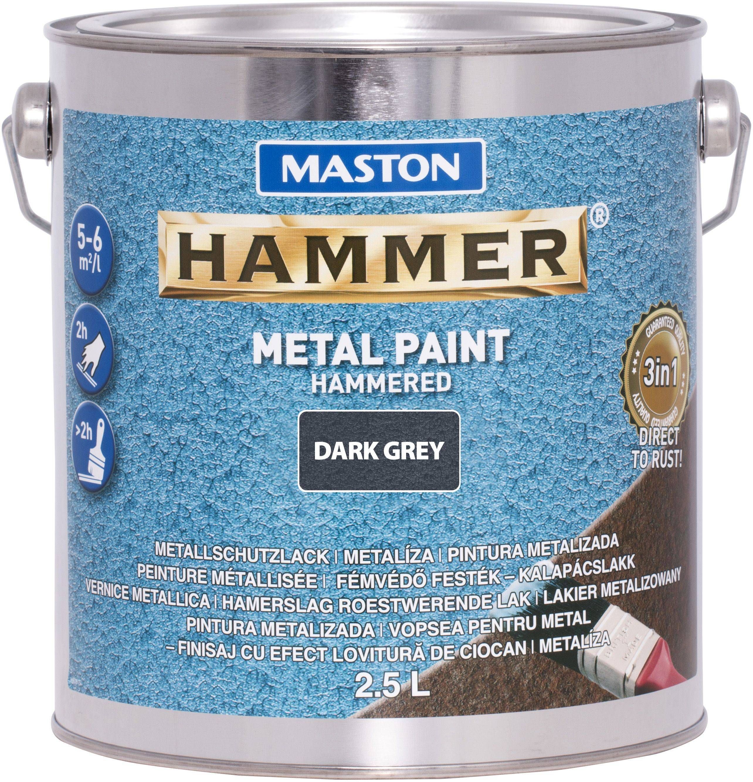 Maston Hammer tumehall vasardatud metallivärv, kus korrosioonivastane aine, krunt ja pealisvärv moodustavad koos tugeva, läikiva pinna kõigile metallpindadele. Sobib kasutamiseks sise- ja välistingimustes. Saab kanda otse töödeldud pindadele, sealhulgas roostes pindadele. Õhku ja niiskust mitteläbilaskev värvikiht peatab korrosiooni ja kaitseb tõhusalt metallpinda. Sobib ka puitpindade töötlemiseks. Metallvärvi katvus on umbes 5 - 6 m²/L, sõltuvalt pealekandmisest ja pealekandmisviisist. Kuivamisaeg on umbes 24 tundi. Täielikult kuiv 7 päeva pärast ja vajadusel ülevärvitav 2 - 8 h jooksul või 8 päeva pärast (+ 20°C/24 h) ainult samatüübilise värviga, st Maston Hammeri värviga. Eeltöötlus: Eemaldage värvitavalt pinnalt lahtine rooste, lahtine ja pragunev värv traatharjaga. Puhastage pind õlidest, rasvadest ja igasugusest muust mustusest. Enne värvimist kuivatage niisked pinnad. Enne kasutamist segage värv hoolikalt. Samuti segage värvi töö ajal. Värvimine: Pintsliga - kasutage sobiva laiusega pintslit, kandke pintsliga risti harjates paks ühtlane värvikiht. Pinna viimistlemiseks pintseldage pind kergelt samasuunaliselt. Vajadusel saate viimistlust uuendada. Rulliga - kasutage looduslikku kiudrulli. Katke pind ühtlaselt. Vajadusel võite värvi lahjendada Hammer XYLENE lahustiga. Pihustiga värvimisel lahustada värvi 5 - 20%. Pakendis 2,5 liitrit.