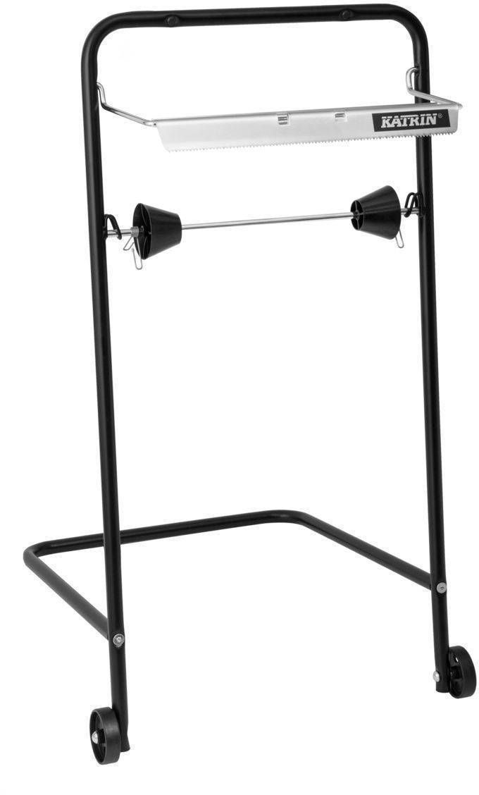 Karin maksirätikuhoidja põrandale suurte professionaalsete rullide jaoks. Hoidjal on 2 ratast, et oleks mugav teisaldada. Rullihoidja külge on võimalik kinnitada raam prügikottide jaoks. Toode on metallist ja musta värvi, sobib rullidele laiusega kuni 40 cm.