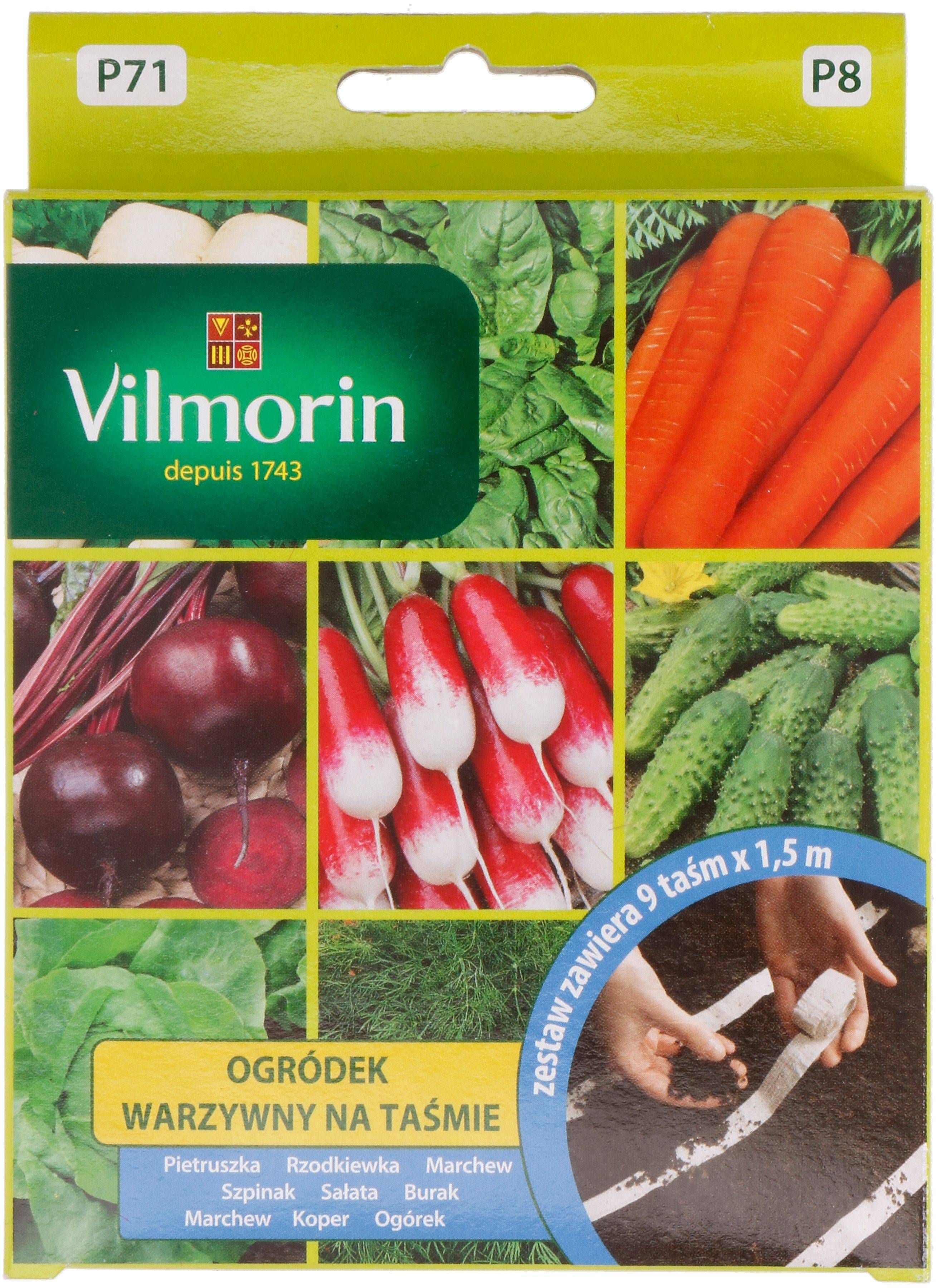 Vilmorin stardikomplekt valmislahenduste eelistajatele. Teibiga seemned lihtsustavad ühtlast külvi ja tagavad rikkaliku saagi. Tänu seemnete optimaalsele paigutusele puudub vajadus harvendamiseks ja taimed kasvavad õigete vahemaadega. Komplekt sisaldab 9 teipi. Igaüks neist on 1,5 m pikkune. Pakend sisaldab: petersell Halblange, redis Flamboyant 2, porgand Nantes 2, spinat Matador, salat Królowa Majowych, peet Moulin Rouge, porgand Autumn King 2, till Moravan, kurk Ela F1 seemnete komplekte teibil. Teibid on biolagunevast materjalist, lahustuvad mullas ja on keskkonnasõbralikud. Edasine teave toote kohta on pakendi sees voldikul.