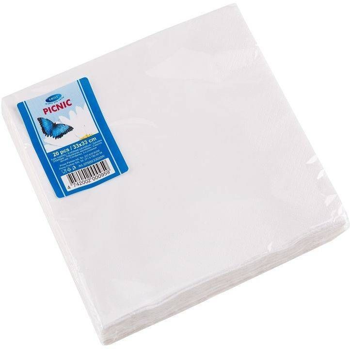 Smile valged 3-kihilised salvrätikud mõõtmetega 33 x 33 cm. Pakis 20 tk.