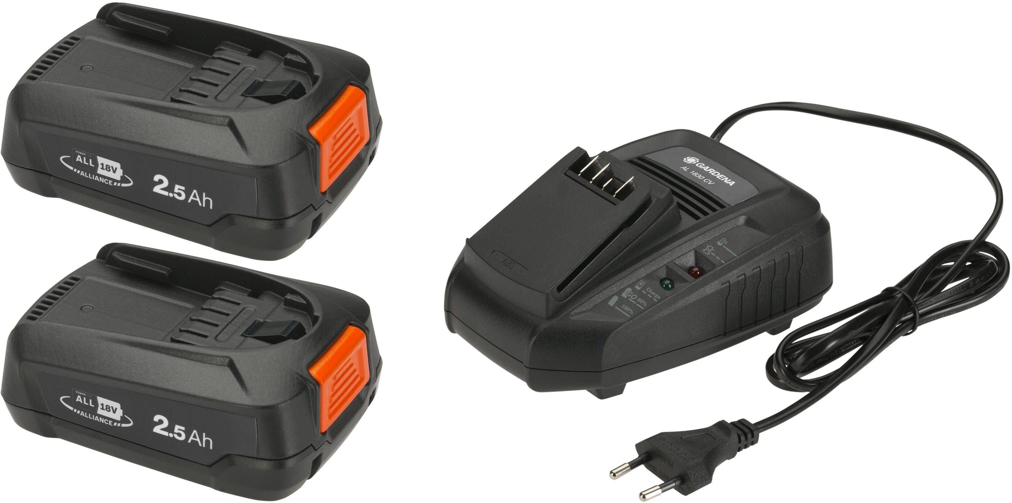 See stardikomplekt koosneb Gardena kiirlaadijast AL 1830 CV ja kahest 2,5 Ah POWER FOR ALL akust.