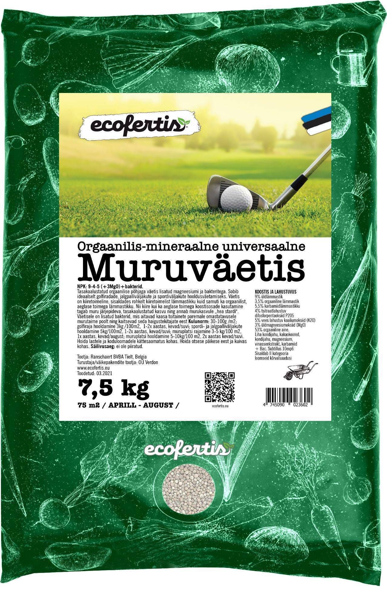 Ecofertis universaalne orgaanilis-mineraalne muruväetis on tasakaalustatud orgaanilise põhjaga väetis, millele on lisatud magneesium ja kasulikud bakterid. Sobib ideaalselt kodumuru, golfiradade, jalgpalliväljakute ja spordiväljakute hooldusväetamiseks. Väetis sisaldab nii kiiretoimelist karbamiidlämmastikku kui ka pikaajaliselt toimivat orgaanilist lämmastikku. Väetise koostis tagab murutaimede järjepideva, tasakaalustatud arengu ning annab murule hea kasvustardi. Väetisele lisatud bakterid aitavad kaasa toitainete paremale omastatavusele murutaime poolt ning kaitsevad seda haigustekitajate eest. Väetisele lisatud magneesium annab murule erksa rohelise värvi. Väetis on loodushoidlik ja pika toimeajaga (kuni 3 kuud) ning vihmavesi ei uhu seda pinnasest minema. Kulunorm on 40-100g /m². Pakendis 7,5 kg.