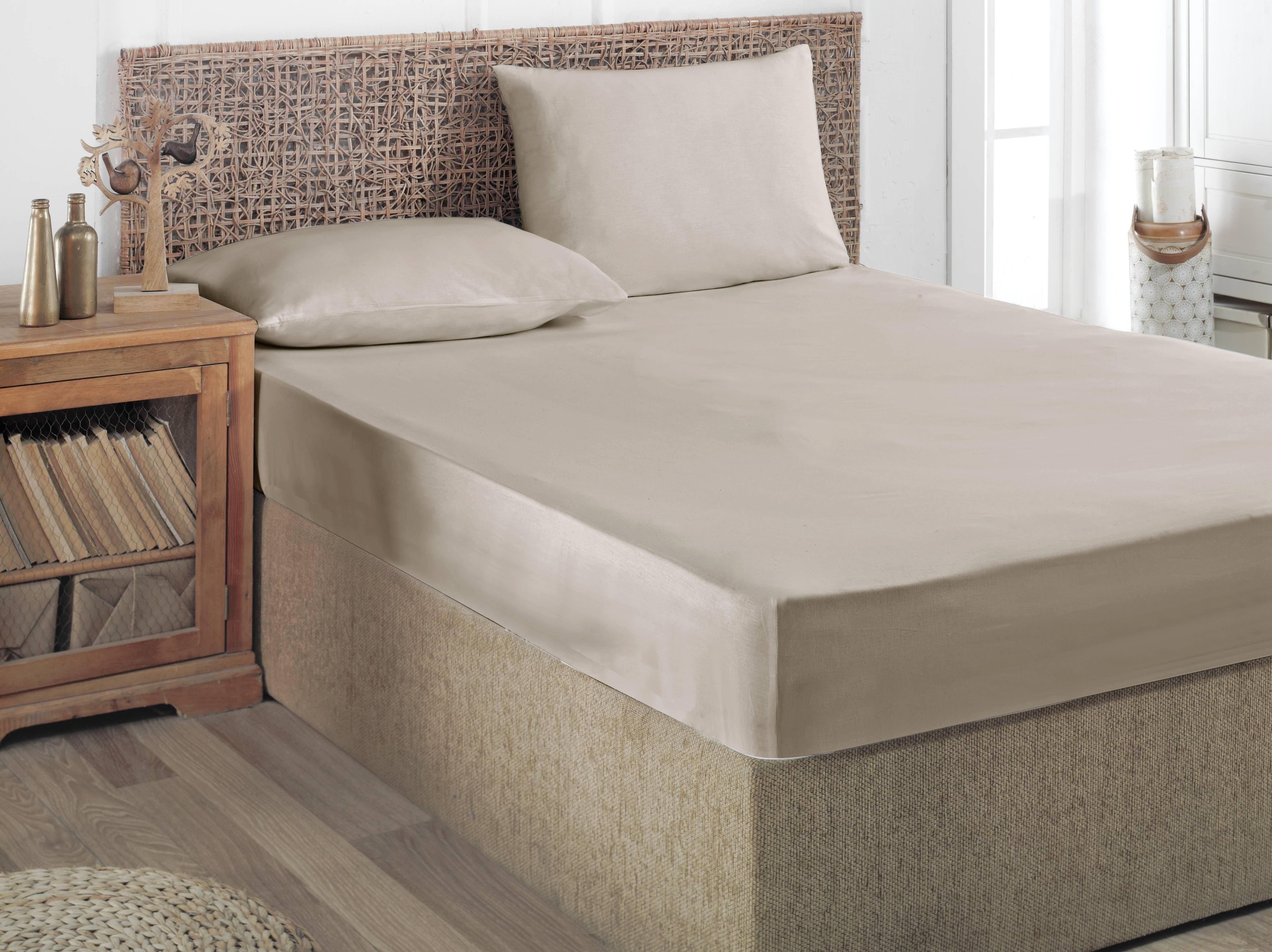 Puuvillasatiinist kummiga voodilina on mõõtmetega 180 x 200 cm ja beeži värvi.