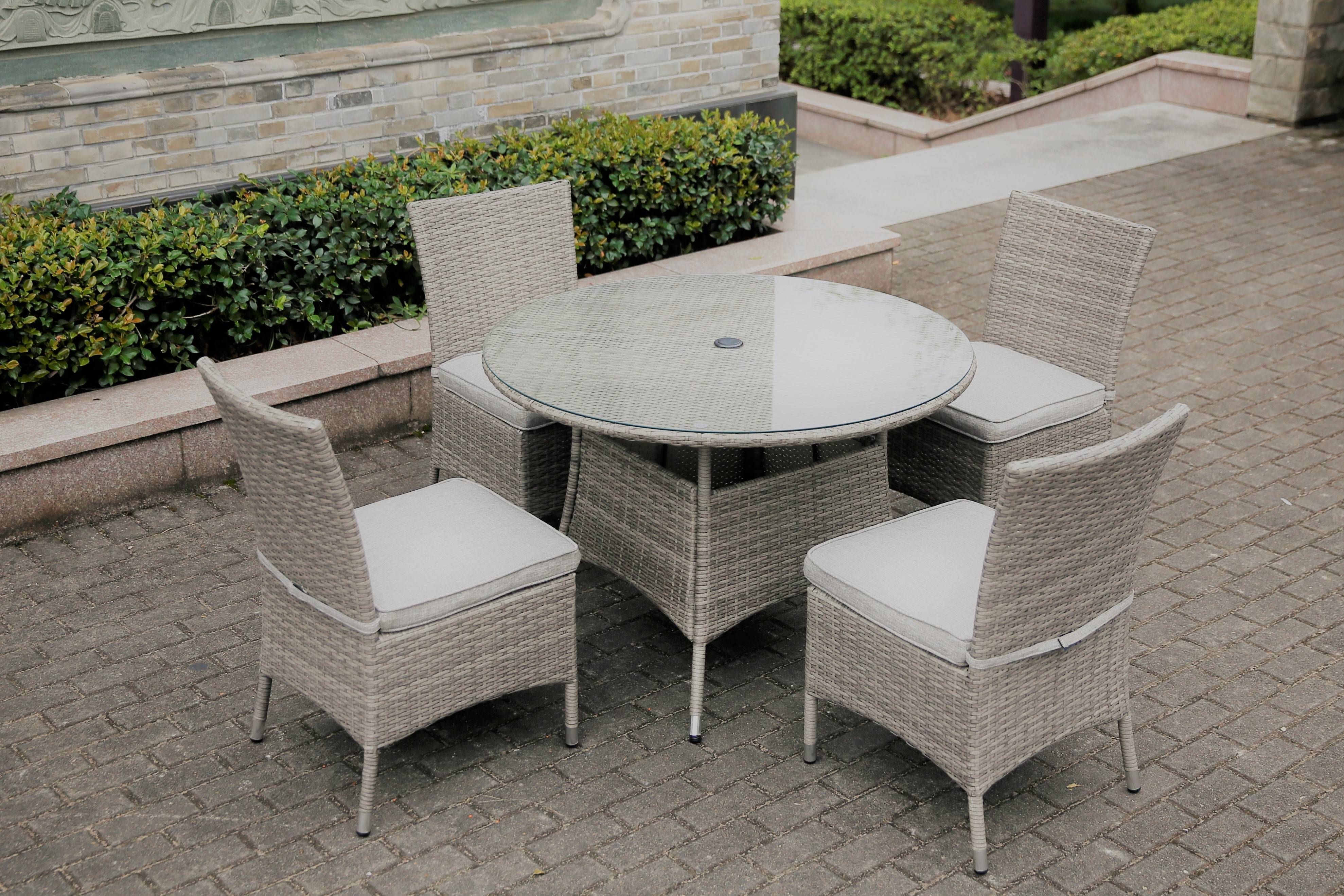 Aiamööblikomplekt 5-osaline. Kasutamiseks välistingimustes. Komplektis on 4 tooli, suurusega 57x48x86 cm ja laud suurusega 110x110x73 cm. Kandevõime toolidel on 90 kg, laual 75 kg. Materjal: alumiinium, rotang polüester, klaas. Toodetud Hiinas.