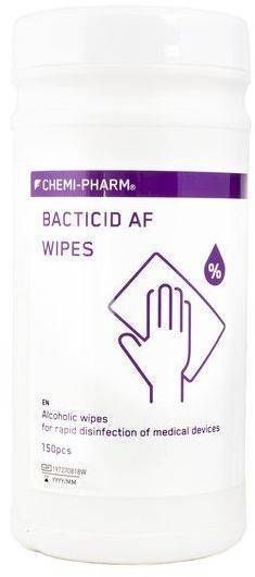 Chemi-Pharm Bacticid Wipes on alkoholibaasilised sünteetilisest materjalist rätikud alkoholi taluvate meditsiiniseadmete pindade kiirdesinfektsiooniks. Toode on laia fungitsiidse ja bakteritsiidse toimega, hävitab Gram-positiivseid ja Gram-negatiivseid baktereid, sh.tuberkuloosi tekitajat, desaktiveerib nii ümbrisega kui ka ümbriseta viirusi (sh HBV, HIV, rota- ja adeno) ja seeni. Pakendis 150 tk.