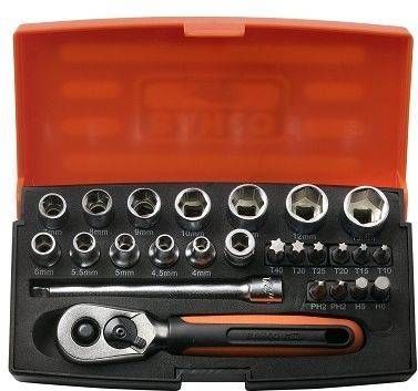 Bahco 1/4" padrunite 4 - 13 mm ja otsakute PH, HEX, TORX komplekt 25-osaline. Komplektis on: kuuskantpadrunid, kompaktne narre, PH2 otsakud, kuuskantotsakud, TORX®-otsakud, otsakuhoidik lukustusvedruga, võnkuv pikendus. Kinnitusvahendite väiksem kulumine ja kahjustumine tänu Dynamic-Drive™-i profiiliga padrunile. Narrel on padruni kiirvabastusnupp. Korpus on valmistatud suure tihedusega polüetüleenist (HDPE), 35 × 165 × 85 mm, SPAR-CASE-A6. Standardid: ISO 1174 ja DIN 3120.