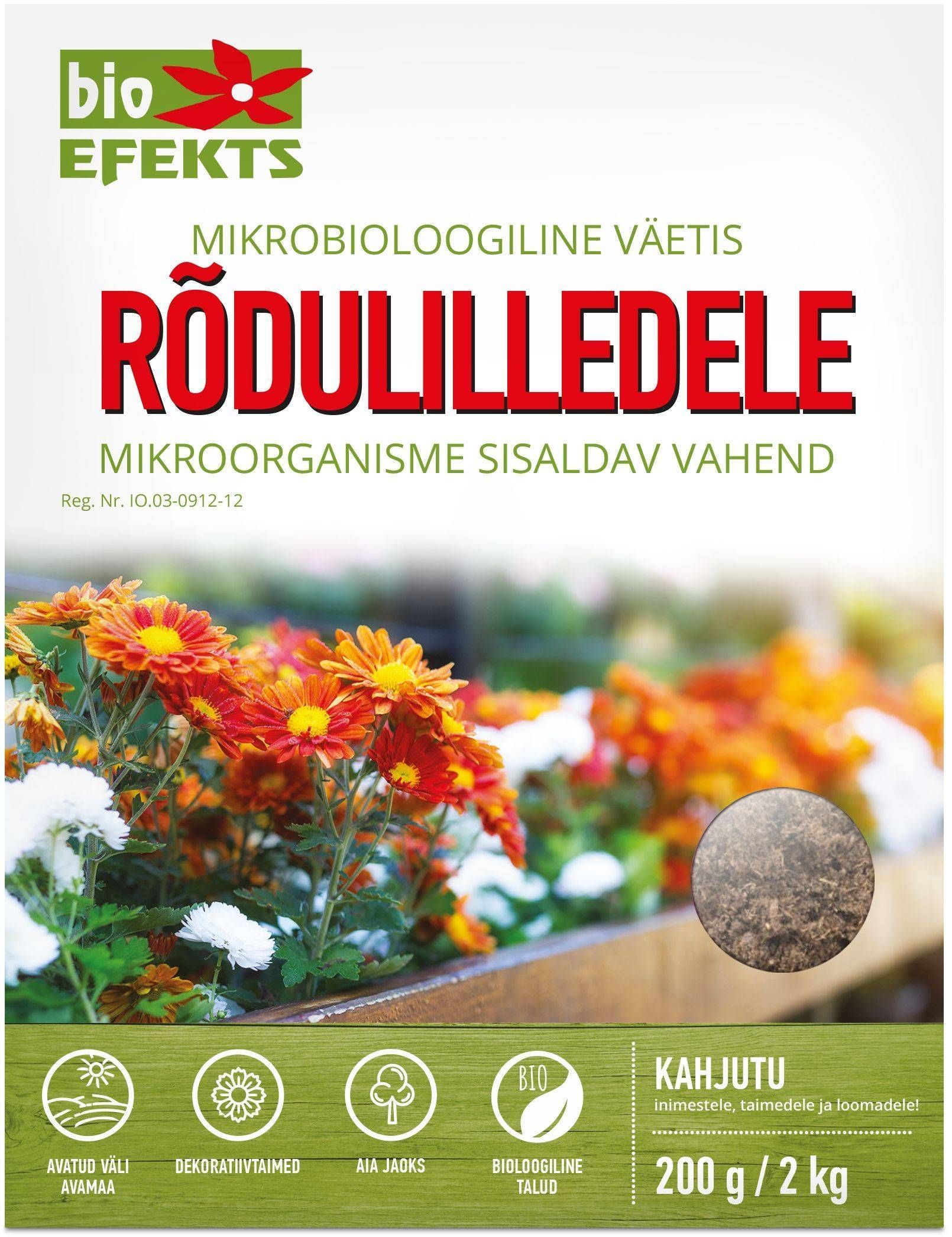Bioefekts mikrobioloogiline väetis rõdutaimedele sisaldab laias valikus mulla mikroorganisme, mis eraldavad vitamiine ja auksiini, seovad õhust lämmastikku ning muudavad selle kasutuskõlblikuks vormiks. Väetis soodustab õitsemist, juurte arengut, tõstab vastupidavust ebasoodsatest tingimustest tingitud stressile ja tugevdab vastupanu haigustele. Väetis tagab soodsa mikrofloora säilimise mullas, antakse 3 korda aastas, soovitatav kasutada istutamise ajal. Kasutamine: 100 g/1 kg mulda. Säilitada kuivas, jahedas, pimedas kohas, eraldi toidust ja loomasöödast, vahemikus +30 kuni +150°C. Mikrobioloogiline preparaat sobib kasutamiseks mahepõllumajanduses vastavalt määruse (EÜ) nr 889/2008 artikli 3 lõigetele 4 ja 5.
