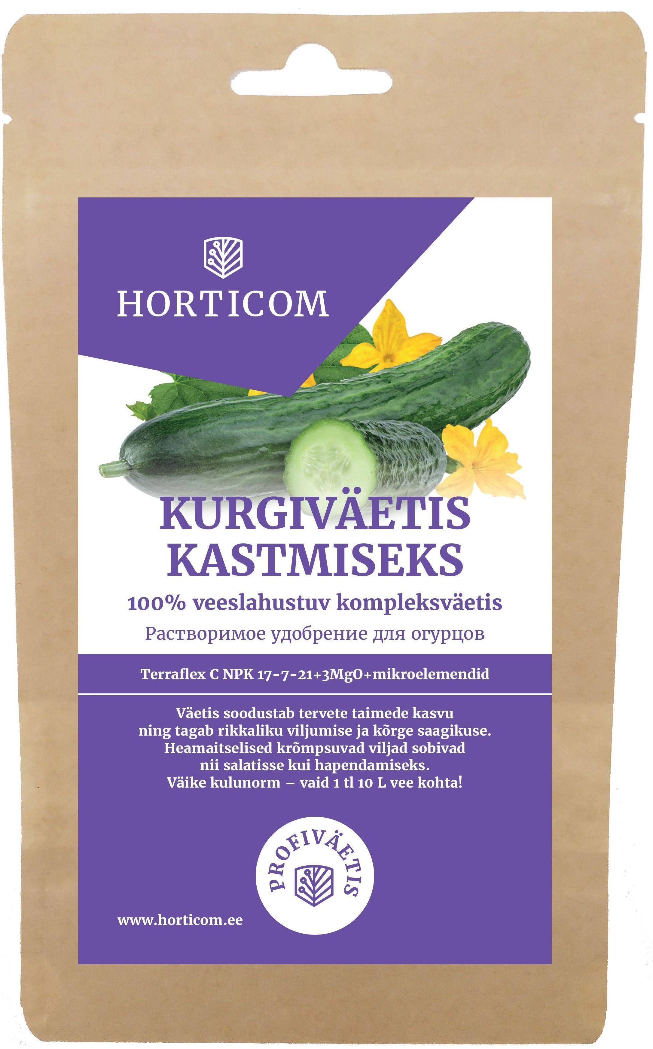 Horticom kurgiväetis kastmiseks. Terraflex C NPK 17-7-21+3MgO+mikroelemendid. 100% veeslahustuv kompleksväetis.Väetis soodustab tervete taimede kasvu ning tagab rikkaliku viljumise ja kõrge saagikuse. Hea maitselised krõmpsuvad viljad sobivad nii salatisse kui hapendamiseks. Kasutamine: lahustage pulber kastmisvees ja kastke 1x nädalas 1 - 1,5 g/L. Väetada hommiku- või õhtutundidel või siis pilves ilmaga. Koostis: (%): Kogulämmastik (N) 17,0; nitraatlämmastik (N-N?3) 10,5; ammooniumlämmastik (N-NH4) 6,5; vees lahustuv fosfor (P2O5) 7,0; vees lahustuv kaalium (K2O) 21,0; veeslahustuv magneesium (MgO) 3,0; vees lahustuv väävel (SO3) 8,7; vees lahustuv boor (B) 0,025; vees lahustuv vask (Cu) 0,004; vees lahustuv raud (Fe) EDTA 0,08; vees lahustuv mangaan (Mn) EDTA 0,05; vees lahustuv molübdeen (Mo) 0,005; vees lahustuv tsink (Zn) EDTA 0,03.