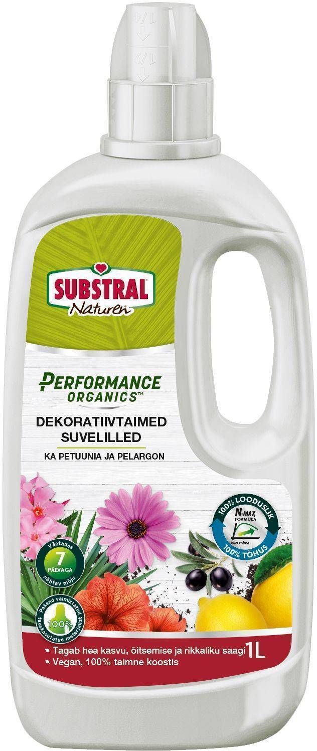 Substral Naturen® petuunia, pelargoni jt väetis Performance Organics. 100% taimne väetis. Taimede poolt kergesti omastatav kiire ja tõhus toime. Tagab hea kasvu, õitsemise ja rikkaliku saagi. N-Max-Formel koostises annab nähtava tulemuse juba 7 päeva pärast. Lastele ja loomadele ohutu.