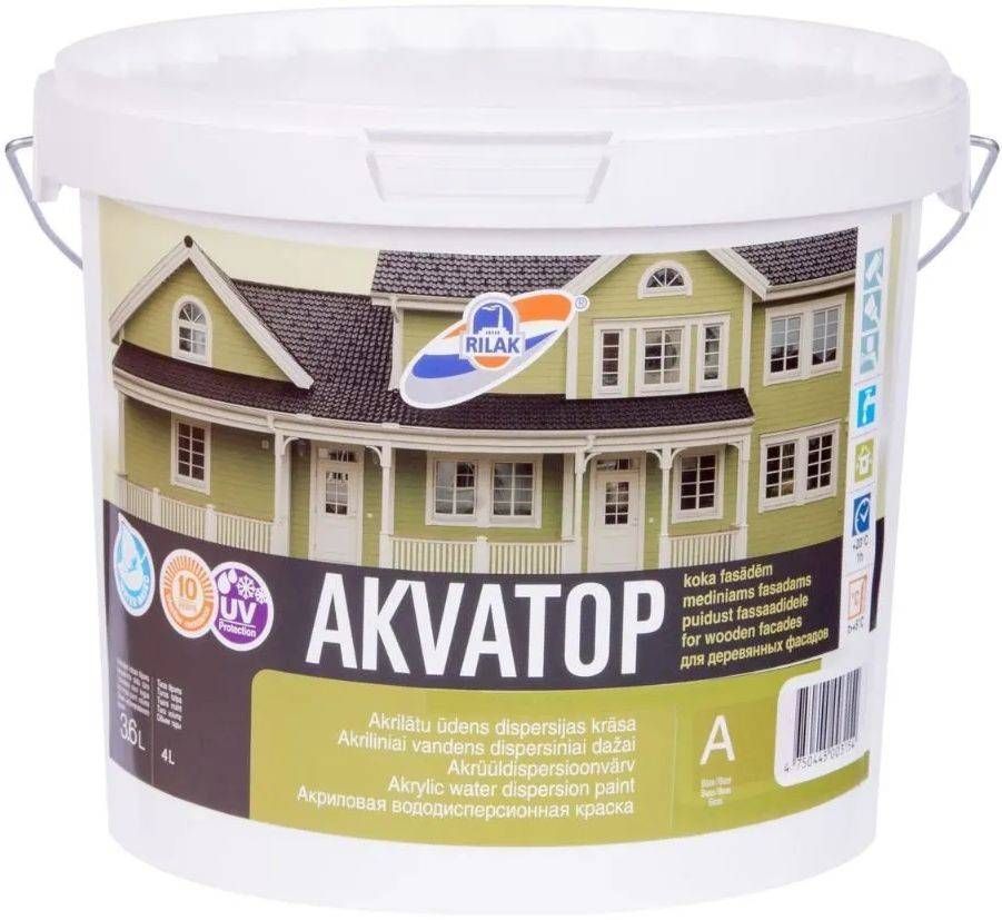 Rilak puitfassaadivärv Akvatop. Kollane poolmatt veebaasil välisvärv puitpindade viimistlemiseks. Värv moodustab elastse ilmastikukindla pinna. Väga hea kattevõime ja nakkega. Kasutustemperatuur on +5 kuni +28°C, katvus 8 - 10 m² /L ja kuivamisaeg 1 tund. Pakendis on 3,6 L.