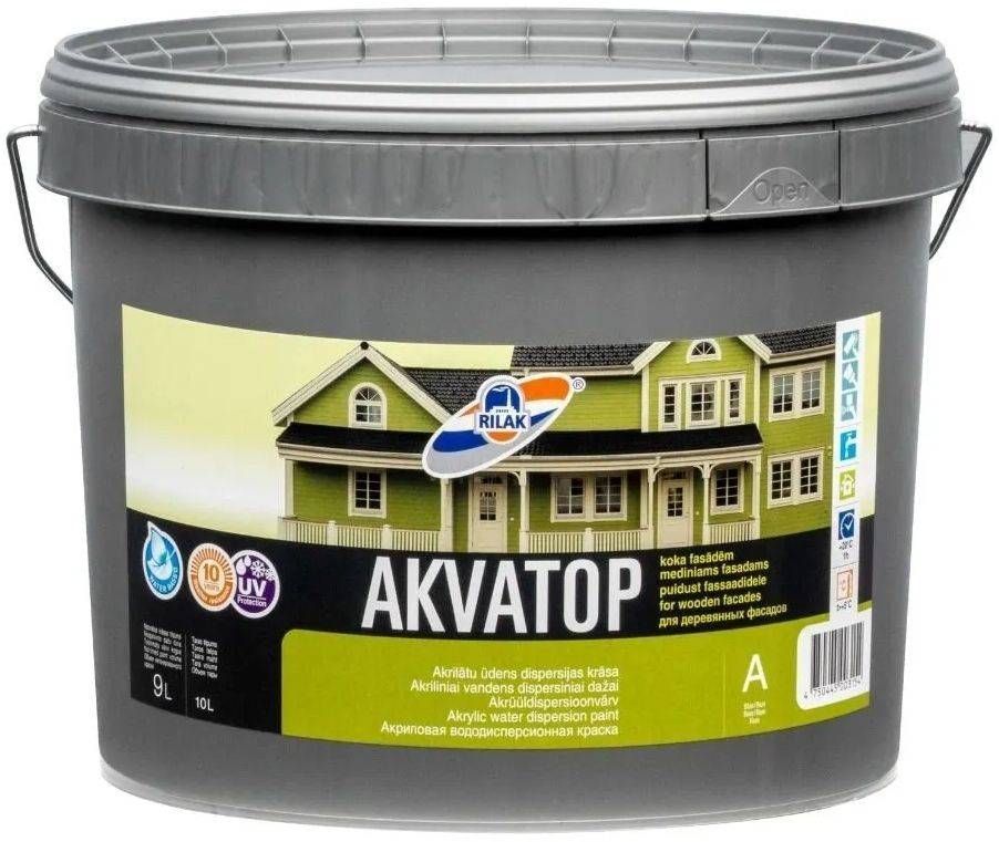 Rilak puitfassaadivärv Akvatop. Must poolmatt veebaasil välisvärv puitpindade viimistlemiseks. Värv moodustab elastse ilmastikukindla pinna. Väga hea kattevõime ja nakkega. Kasutustemperatuur on +5 kuni +28°C, katvus 8 - 10 m² /L ja kuivamisaeg 1 tund. Pakendis on 9 L.
