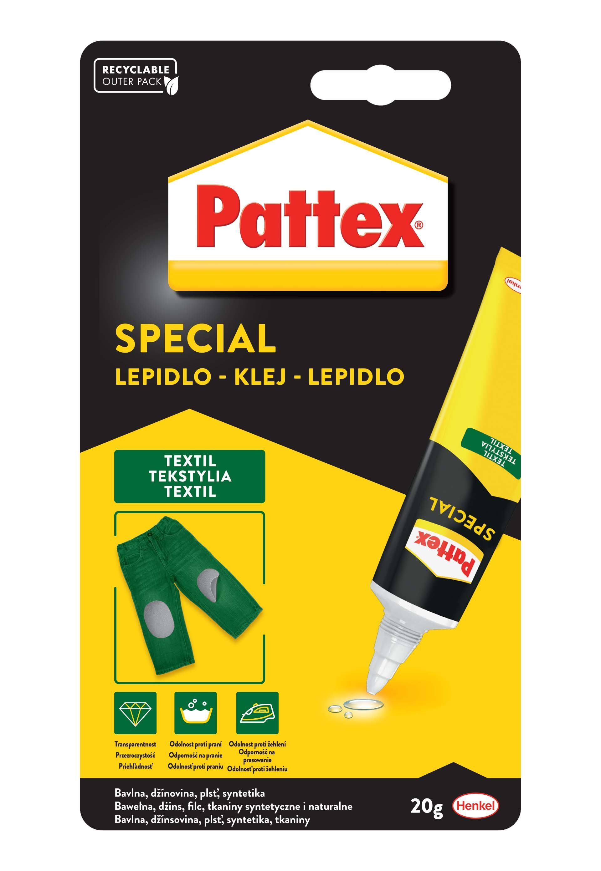 Pattex spetsiaalne tekstiililiim. Kuivanult läbipaistev, pestav ja triikimiskindel. Tekstiilmaterjalide, nt puuvilla, teksa, linase, vildi, sünteetiliste kiudude liimimiseks, sh puidu, naha ja metalliga kombineerituna. Ei sobi materjalidele PE, PP, PTFE Styropor® ja õrnadele tekstiilidele (siid jne).