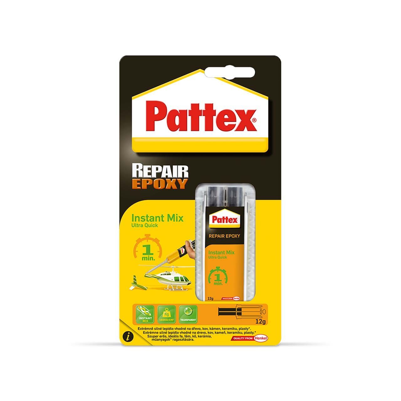 Pattex kiiresti kõvastuv universaalne kahekomponentne epoksüliim. Kivistub 1 minutiga. Vee-, õli- ja lahustikindel. Kivistumisel ei tõmbu kokku ega paisu. Pärast kivistumist võib värvida, lihvida, puurida või teisiti mehaaniliselt töödelda. Lihtne pealekandmine seguri abil. Puuduvad lenduvad lahustid, sobib igapäevaseks kasutuseks. Liim on ette nähtud peaaegu kõigi materjalide liimimiseks, parandamiseks ja kinnitamiseks: puit, metall, klaas, keraamika, kummi, naha, kivi, papp ja enamik plaste. Pole soovitatav PP, PE ja PTFE (Teflon®) liimimiseks.