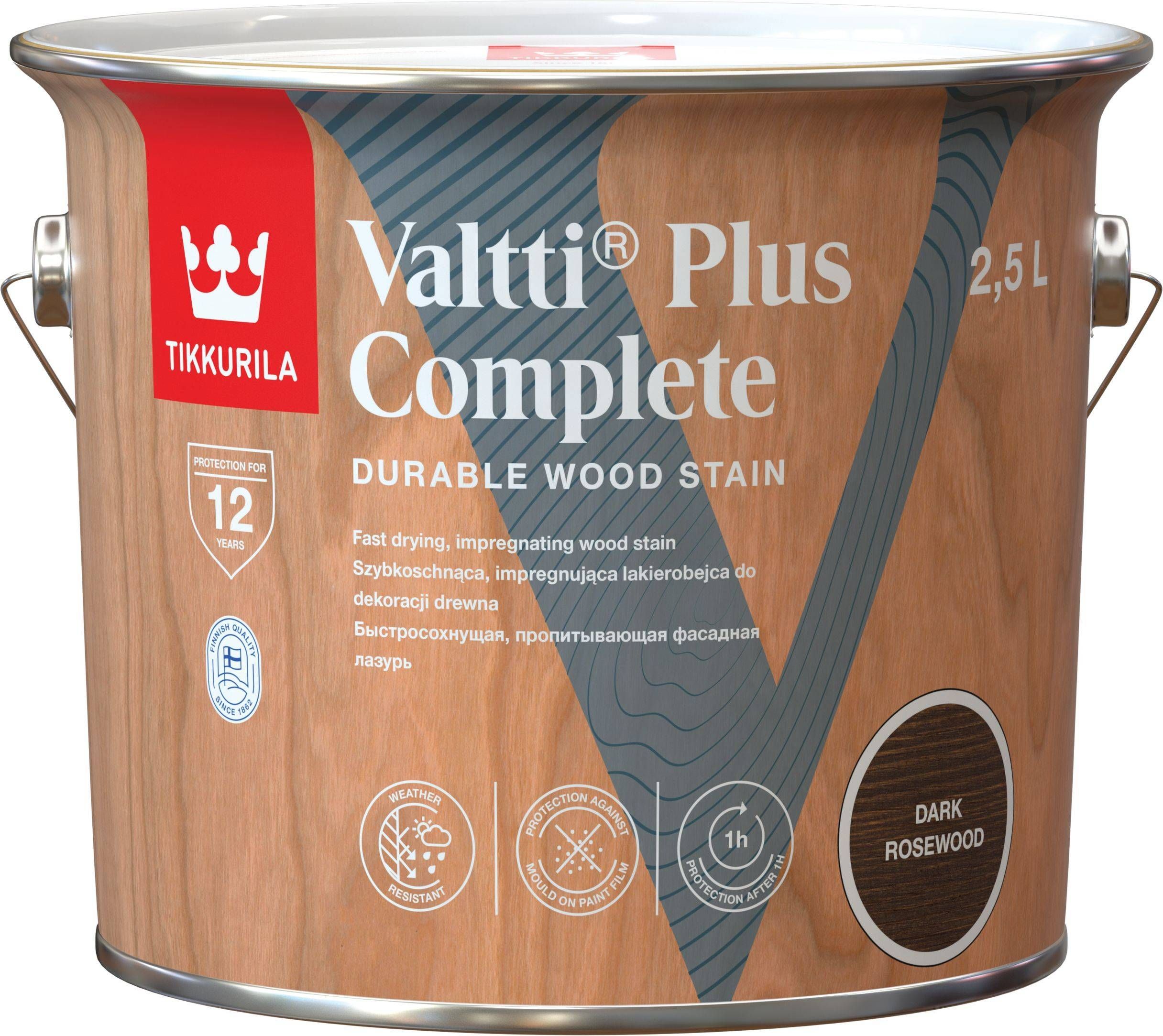 Tikkurila Valtti Plus Complete on kiiresti kuivav, väga vastupidav veepõhine puidulasuur välistingimustesse. Tiksotroopsed omadused tagavad toote lihtsama pinnale kandmise ning vähendavad tilkumist ja voolamist. Uuenduslik kolme vaigu süsteem annab väga hea vastupidavuse ja kaitse kõigis ilmastikutingimustes. Toob esile puidumustri ja jätab kauni naturaalse mati pinna. Puidulasuur imendub sügavale puitu ning tõrjub vett ja niiskust. Tõhus kaitse hallituse eest! Kaitseb puitu UV- kiirguse eest (kahekordne UV-kaitse). Kaunis ja kauapüsiv lõpptulemus! Toode on saadaval nii valmistoonidena (kuus valmistooni) kui ka toonitavana.