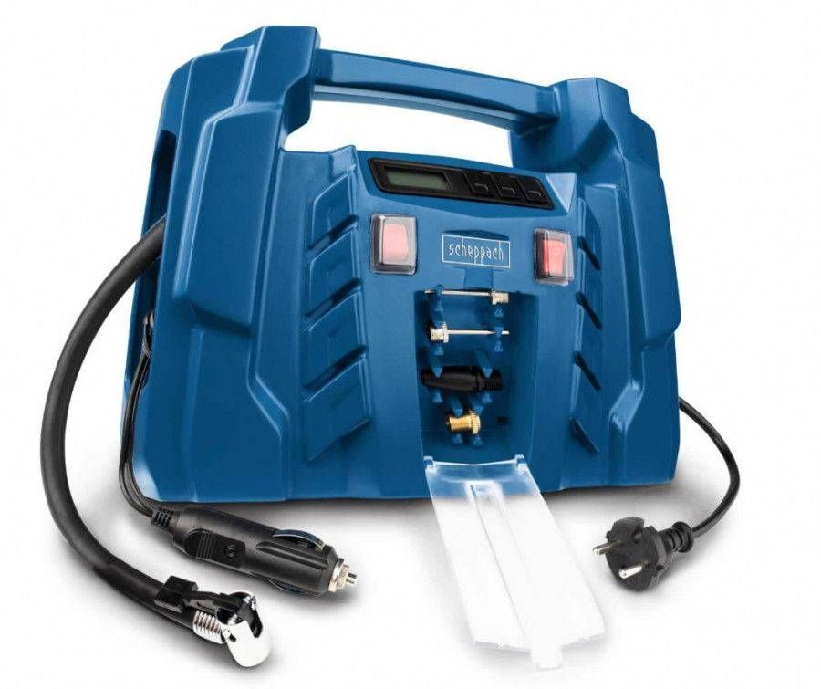 Scheppach kompressor Air Force 5 tarvikutega. Maksimaalne töösurve 8 bar, sissetõmbe kiirus 36,5 L/min. Võimalik kasutada nii sigaretisüütajast kui vooluvõrgust. Digitaalne integreeritud manomeeter - võimalik fikseerida soovitud lõppsurve pumpamisel, vahemikus 0,1 - 8 bar, automaatne kompressori seiskamine soovitud lõppsurve saavutamisel. Pumpamisvooliku pikkus on 0,6 m + autorehvi pumpamisotsik. Kompressori komplektis on 4 erinevat otsikut jalgrattarehvide, pallide, madratsite jne pumpamiseks, kaablid ning vooliku saab kompressori transpordiks paigaldada seadme küljekorpuse sisse. Väga väike ja kompaktne kompressor, mida on lihtne ja mugav kasutada ning mis peaks olema igas majapidamises või autos.