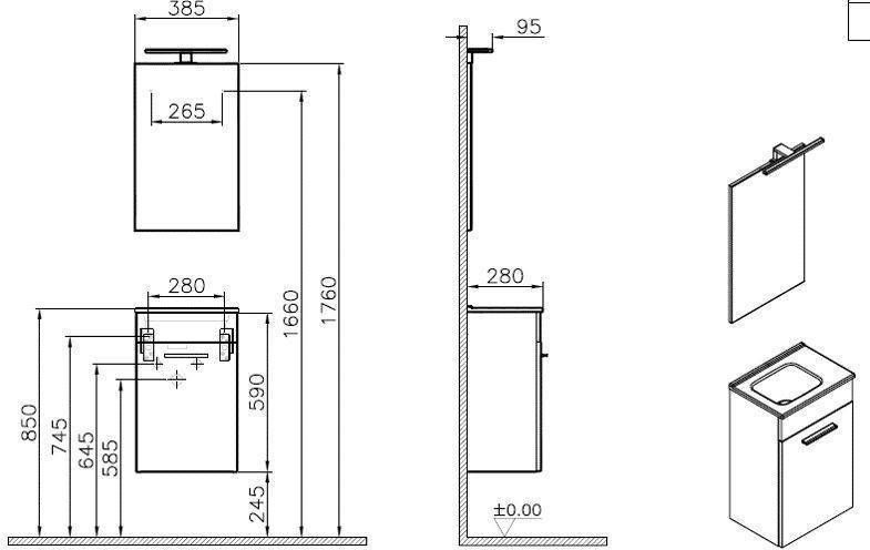 | Komplekti kuulub | Seinale kinnitatav valamukapp, valge keraamiline valamu, sifoon, LED-valgustiga peegel ja kinnitustarvikud |