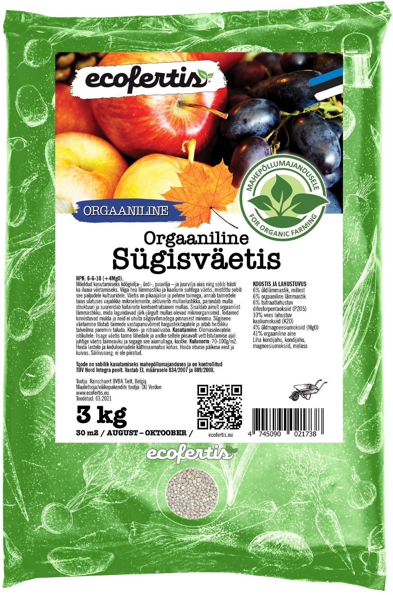 Ecofertis orgaaniline sügisväetis on mõeldud kasutamiseks köögivilja-, ürdi-, puuvilja – ja juurvilja aias ning sobib hästi ka iluaia väetamiseks. Väga hea lämmastiku ja kaaliumi suhtega väetis, mistõttu sobib see paljudele kultuuridele. Väetis on pikaajalise ja pehme toimega, annab taimedele laias ulatuses vajalikke mikroelemente, aktiveerib mullaelustikku, parandab mulla struktuuri ja suurendab toitainete kontsentratsiooni mullas. Sisaldab ainult orgaanilist lämmastikku, mida lagundavad järk-järgult mullas olevad mikroorganismid. Toitained kinnistuvad mulda ja neid ei uhuta sügisvihmadega pinnasest minema. Sügisene väetamine tõstab taimede vastupanuvõimet haigustekitajatele ja aitab heitlikku talveilma paremini taluda. Kloori- ja nitraadivaba.