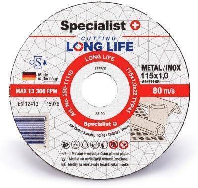 Specialist+ lõikeketas Metal/Inox 115 x 1,0 x 22 mm. Sarja Long life kettad Inox on üliefektiivsed ja turvalised. Valmistatud hoolikalt valitud kõrgeima klassi abrasiivainetest ja erilisest liimisegust ning kasutades tehnoloogiat HYDRO PROTECT, mis ei lase niiskusel ketta sisse tungida ja pikendab ketta tööiga (teadagi minetab enamik kettaid aastaga koguni 60% omadustest). Inoxi kettad sobivad erinevate metallide ja roostevaba terase lõikamiseks. Ei sisalda väävlit, rauda ega muid ühendeid, tänu millele ei kahjusta tervist ja sobib suurepäraselt roostevaba terase lõikamiseks.