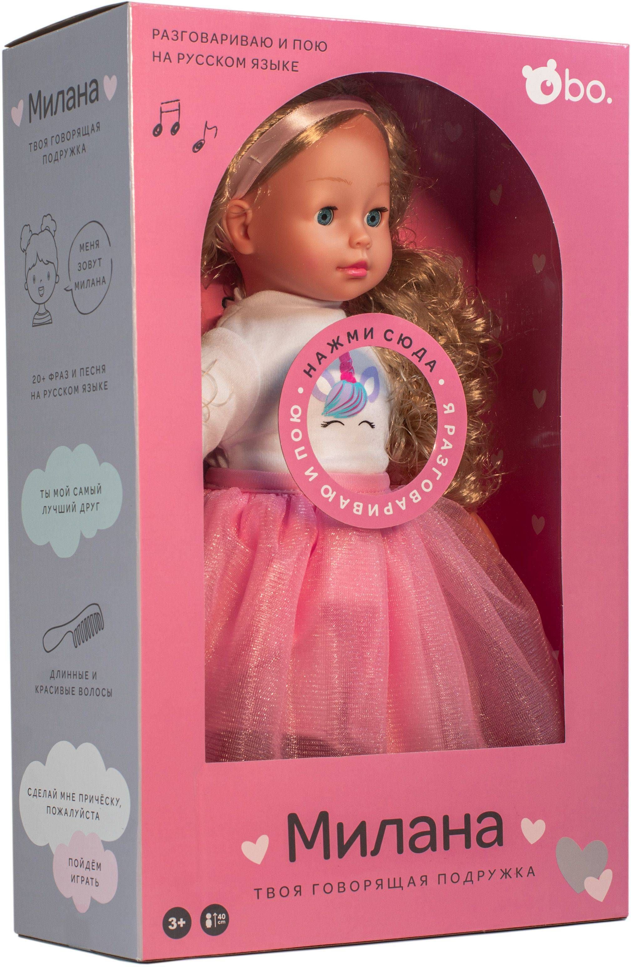 Tere tulemast bo. sõprade armsasse maailma, kus rõõmsad vestlused ja loomingulised mängud ei lõpe kunagi! Rääkiv nukk Milana on sinu uus imeline sõber! Tal on pikad, kammitavad blondid juuksed, millega saab luua palju soenguid ja kaunid sinised silmad, mis sulguvad kui teda selili panna. Milanal on seljas stiilne roosa seelik, ükssarviku pildiga valge särk, armsad roosad kingad ja vaata milline ilus peapael on tal juustes! Milana räägib vene keeles üle 20+ fraasi ja laulab sulle ka ühe laulu. Vajuta ta pehmet kõhtu, et kuulda mida ta sulle räägib! Kammi juukseid ja tee soenguid, kaisuta, mängi ja räägi temaga! Milana on sinu uus rääkiv sõbranna! Nukk on 40 cm pikk.