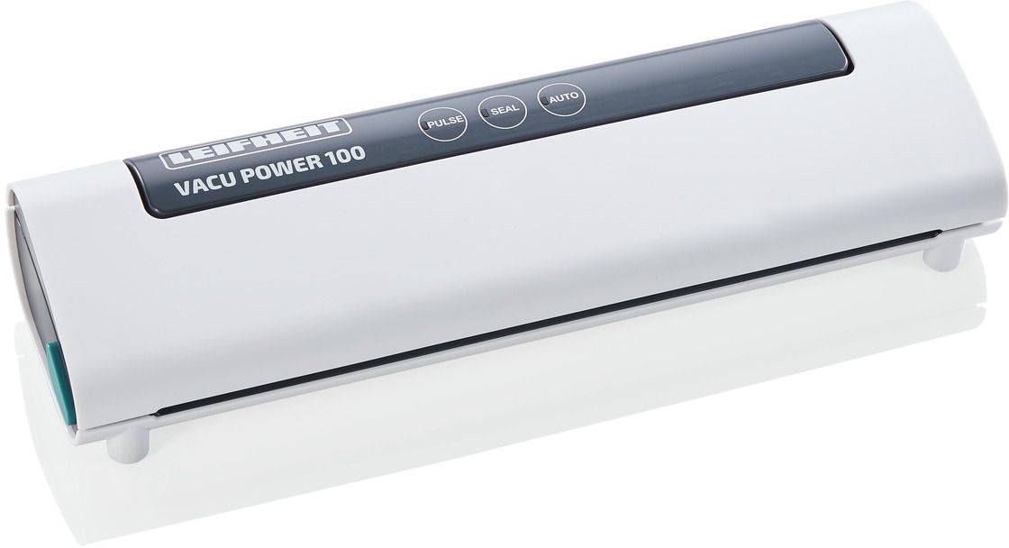 Leifheit Vacu Power 100 täisautomaatne elektriline vaakumpakendaja sobib marjade, puuviljade, liha, kala, juurviljade ja paljude muude toiduainete pakendamiseks ja paremaks säilitamiseks. Efektiivse vaakumpumba jõudlus kuni 4 liitrit minutis. Vaakumpakendamine tagab toiduainetele pikema säilivusaja ilma säilitusaineid kasutamata. Seadmel on sensoriga puutetundlikud nupud, mis muudavad selle kasutamise lihtsaks. "Pulse" funktsioon võimaldab seadmel reguleerida vaakumi tugevust, seetõttu on see sobilik ka õrnema tekstuuriga toiduainete vaakumpakendamiseks. Vacu Power 100 vaakumpakendamise seadmega on võimalik tekitada vaakumkeskkonda ka toidukarpidesse, lisaseadmeid on võimalik soetada kaubandusest. Turvaliseks ja ohutuks kasutamiseks on seadmel elektrooniline temperatuurikontrolli funktsioon, mis takistab pakendite plastikute sulamist või kõrvetamist. Vaakumpakendaja on kompaktne ning seetõttu lihtne hoiustada. Komplekti kuulub vaakumpakendamise seade ja 10 plastikkotti suuruses 20 x 30 cm. Seadmele sobivad kõikide kaubamärkide vaakumkotid laiusega kuni 30 cm.