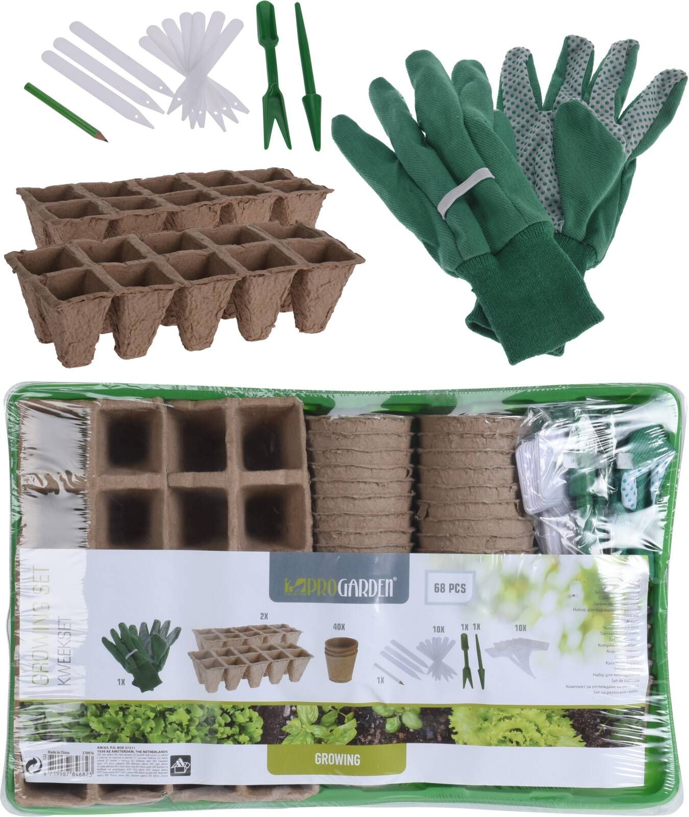 Progarden 68-osaline ettekasvatus komplekt. Komplekti kuuluvad: külvikast 10 istutuskohaga, kasvupott 40 tk, taimesilt 10 tk, etikett 10 tk, jaotur seemnetele 2 tk, pliiats, kaas, paar kindaid. Külvikast on mõõtmetega 370 x 230 x 55 mm.