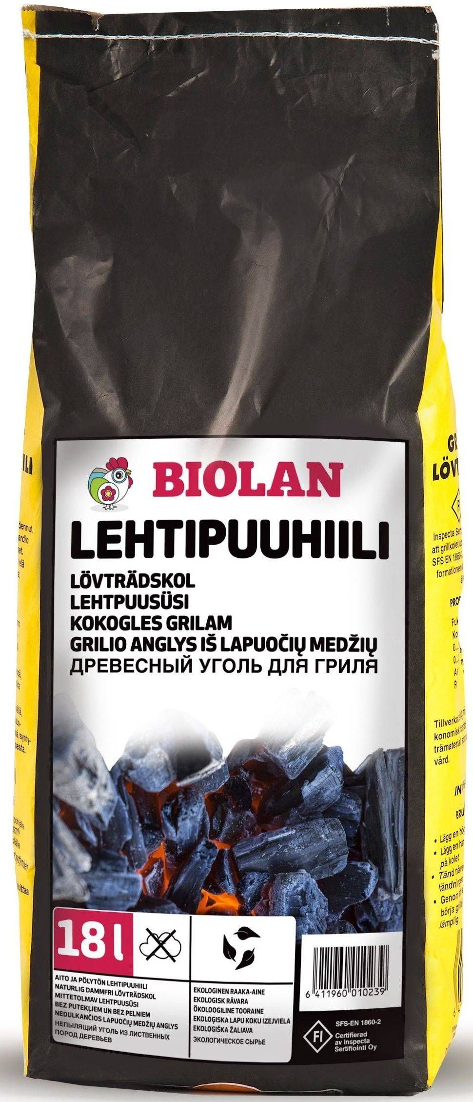 Biolan kõrgekvaliteediline lehtpuusüsi grillidele ja kaminatele. Valmistatud Eestist pärit keskkonnasõbralikul ja energiasäästlikul moel metsatööstusest tulevast puutoormest. Toode vastab kõrgeimatele tootmis-standasditele. Pakendi maht on 18 l.