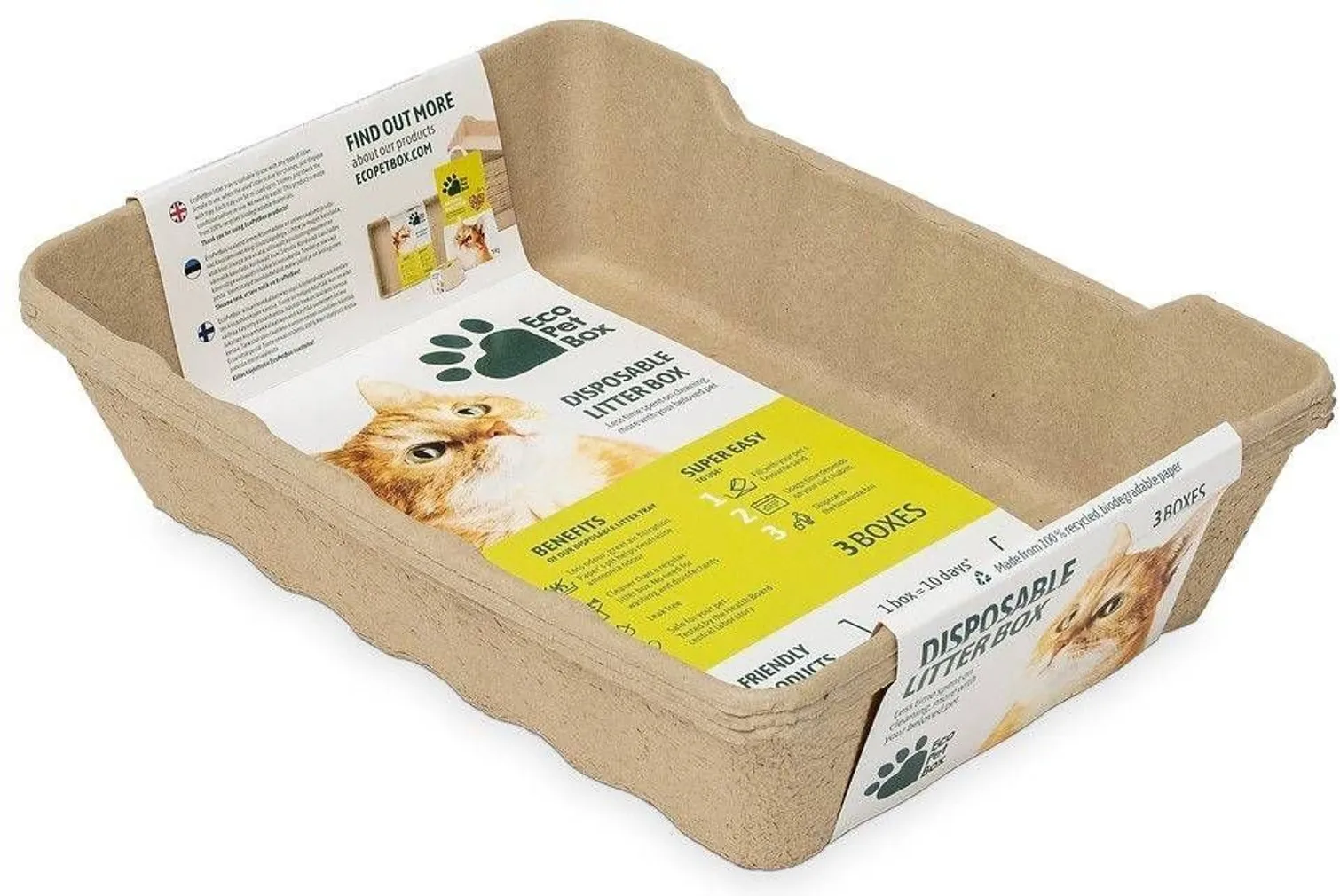 EcoPetBox biolagunev lemmiklooma tualett on valmistatud 100% taaskasutatud biolagunevast papist. Vähendab oluliselt bakterite ja haiguste levikut ning on ohutu lemmikloomale – testitud Terviseameti kesklaboris. Tualetil on lihtne juurdepääs liivaalusele ja see on lekkevaba. Suurepärane õhufiltratsioon ja vähem ebameeldivat lõhna, kuna materjali pH neutraliseerib ammoniaagi lõhna. Ei vaja pesemist ja desinfitseerimist. Superlihtne utiliseerimine ja puhastamine, mugav reisimisel kasutamiseks. Pakis on 3 tk.